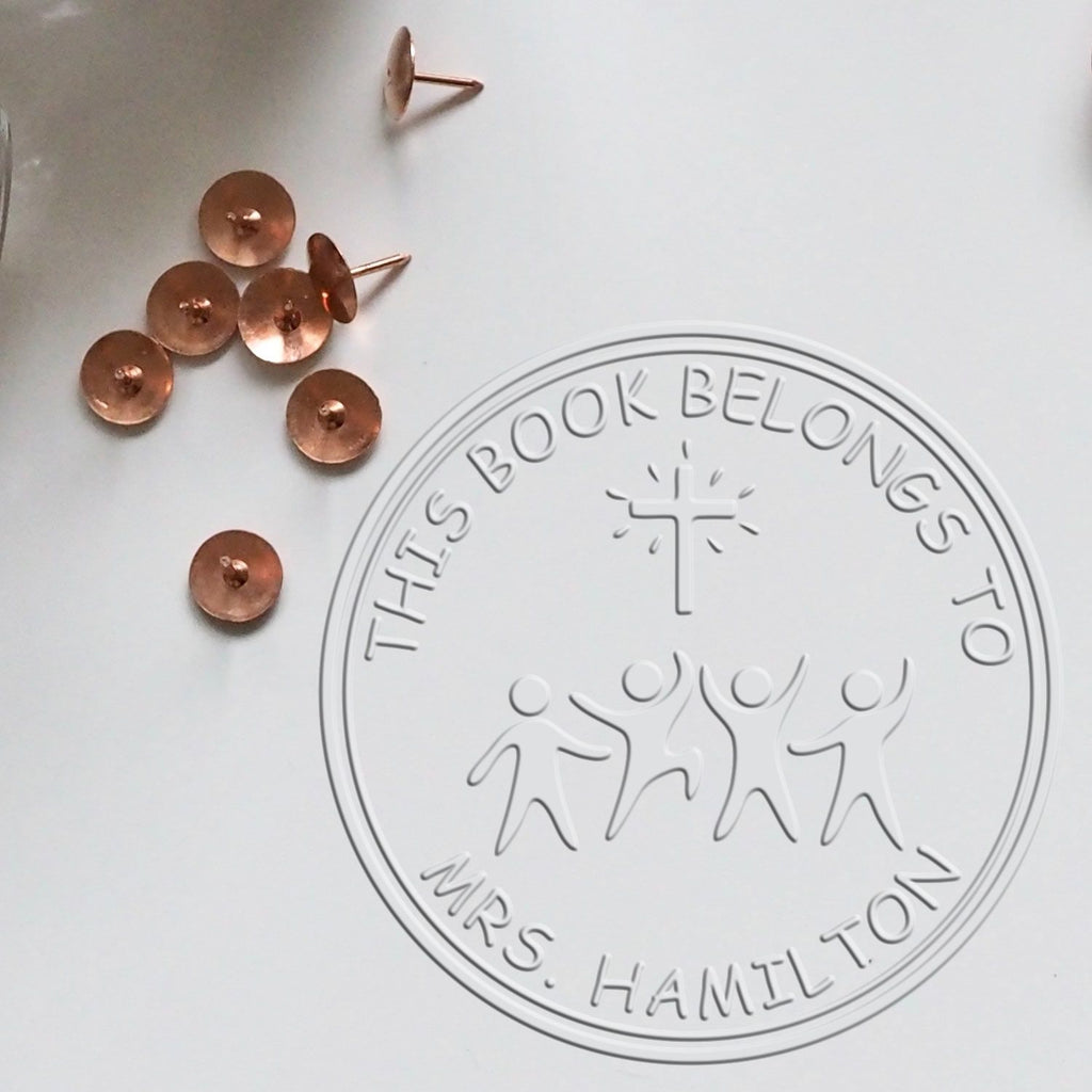 Precision Meets Innovation Step into a world where innovation meets artistry. Our hybrid seal embossers are engineered to deliver impeccable results every time. The 1-5/8" diameter impression features a stunning design that includes an inspiring cross with people praising, surrounded by the words "From The Library of" and "Read it, Love it, Return it". This unique design not only personalizes your books and documents but also adds a touch of elegance that is sure to impress.