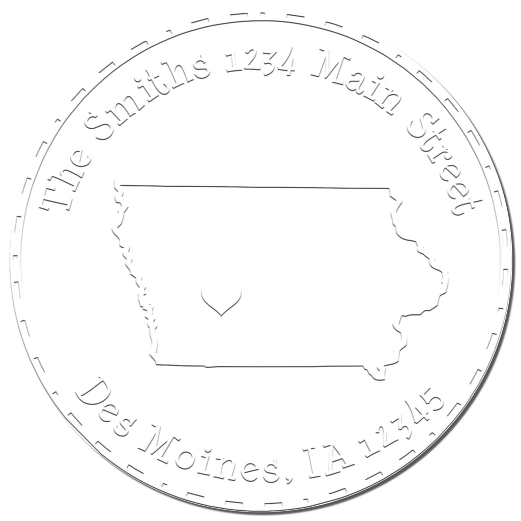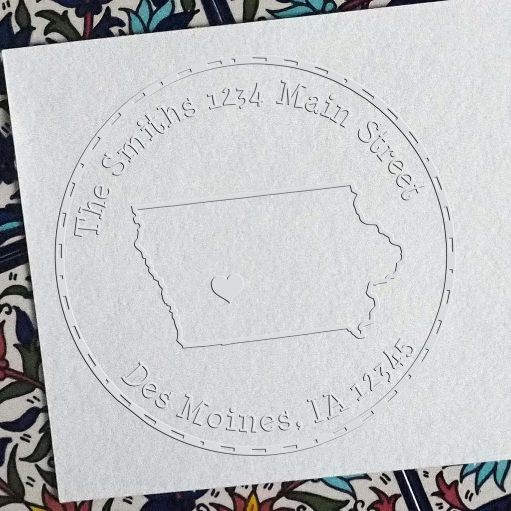 Elevate your mailings to a whole new level of elegance with our exquisite Hybrid Iowa Personalizable Return Address Embossing Seal! This stunning 1-5/8" round embosser is not just a tool; it’s a statement piece that transforms ordinary envelopes into captivating works of art. Featuring a breathtaking design that highlights the outline of the great state of Iowa, complete with a chic heart over the capital, this embosser is perfect for small business owners in Iowa looking to add a professional touch to their correspondence. Impress your recipients and make every piece of mail unforgettable—don’t just send mail, send a statement! Order your artistic address embosser today and watch your envelopes stand out like never before!