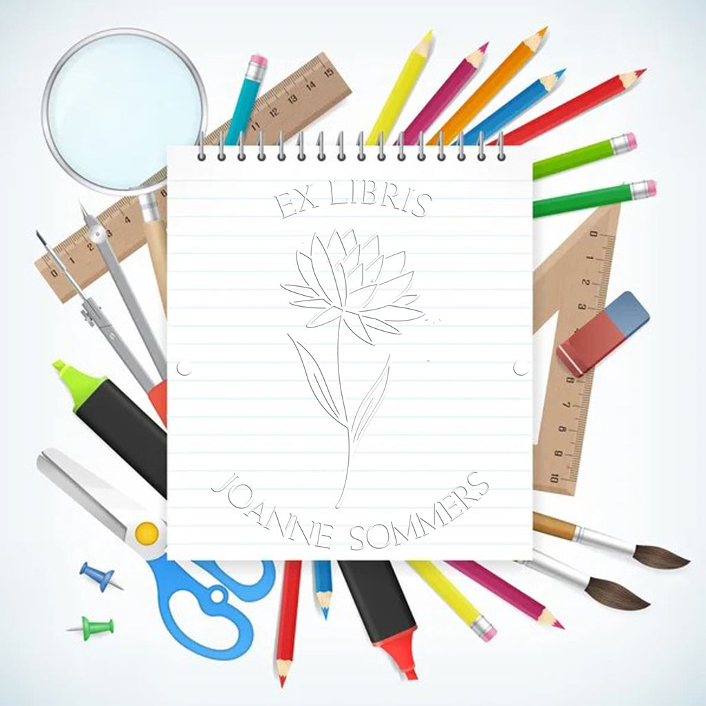 Stylish Choices: Why not express your unique flair while you work? Choose from chic black or playful pink handles that reflect your personal style. The elegant design features a center image of the July birth month flower, the Water Lily, surrounded by phrases such as "This Book Belongs To," "From The Library of," or "Ex Libris" at the top arc, followed by your name or another saying at the bottom arc. This customization makes your embosser not just a tool, but a statement piece!