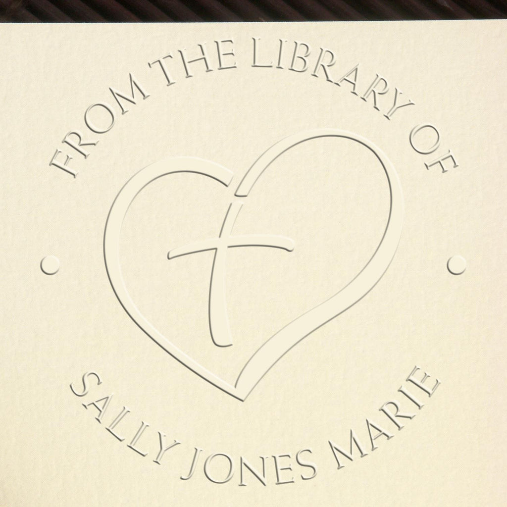 Unique Design Features This library stamp features a stunning center image of a Cross surrounded by a heart, symbolizing love and faith. The clean round design includes phrases such as "This Book Belongs To," "From The Library of," and "Ex Libris" at the top arc, followed by your name or a personalized saying at the bottom arc. The top and bottom arc texts are elegantly separated by two dots in the center, creating a balanced and sophisticated look. With an impression size of 1-5/8" in diameter, your embossing will be perfectly sized for any book or document.