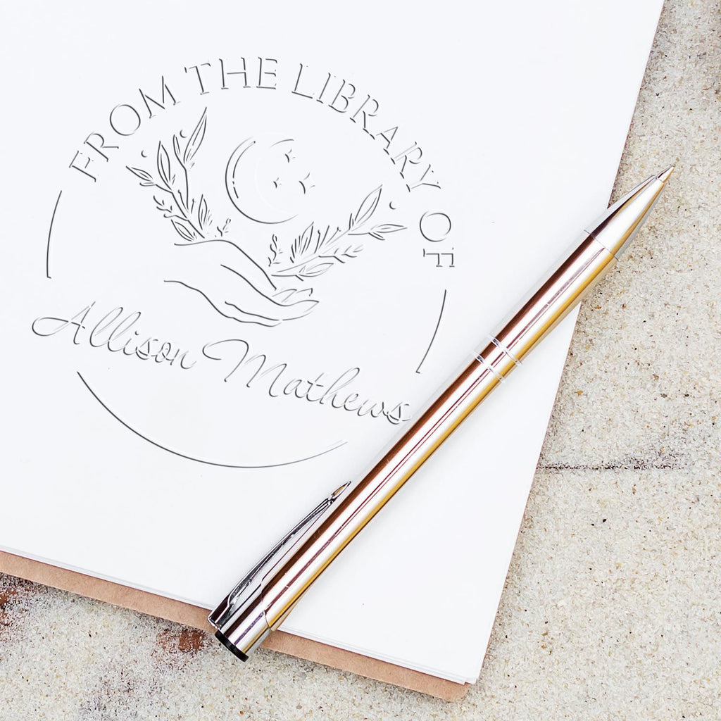 - CUSTOM LIBRARY BRANDING: Create a sophisticated Ex Libris mark with your personalized text and our signature moon-in-hands motif. Ideal for personal collections or institutional use.