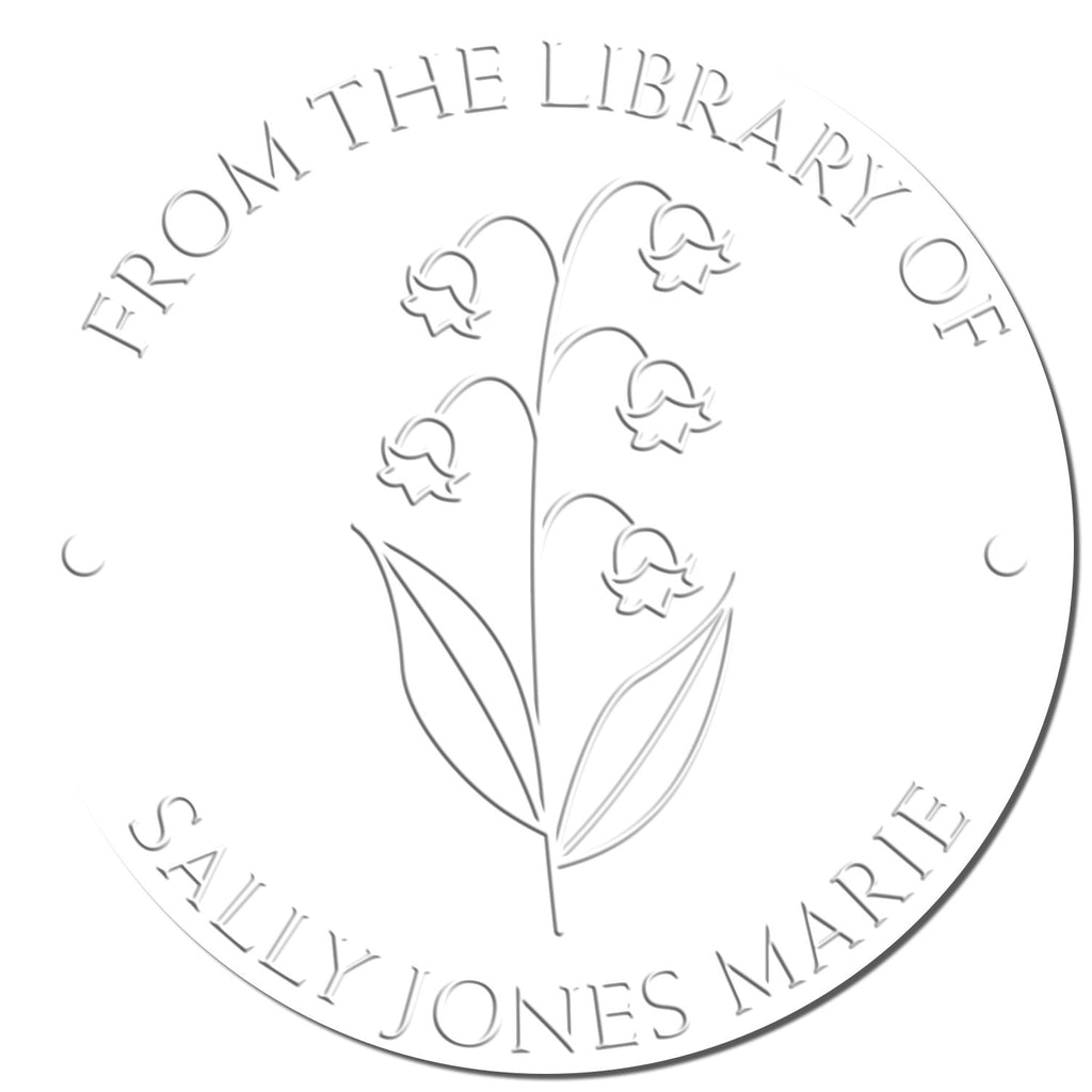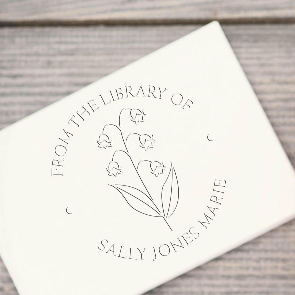 Product Details This library stamp features a center image of the May birth month flower, the Lily of the Valley. The design includes a clean round shape with phrases such as "This Book Belongs To", "From The Library of", or "Ex Libris" at the top arc, followed by your name or another saying at the bottom arc. The top and bottom arc texts are separated by two dots in the center, creating a beautiful and professional impression. The impression size is 1-5/8" in diameter, making it the perfect size for any book.