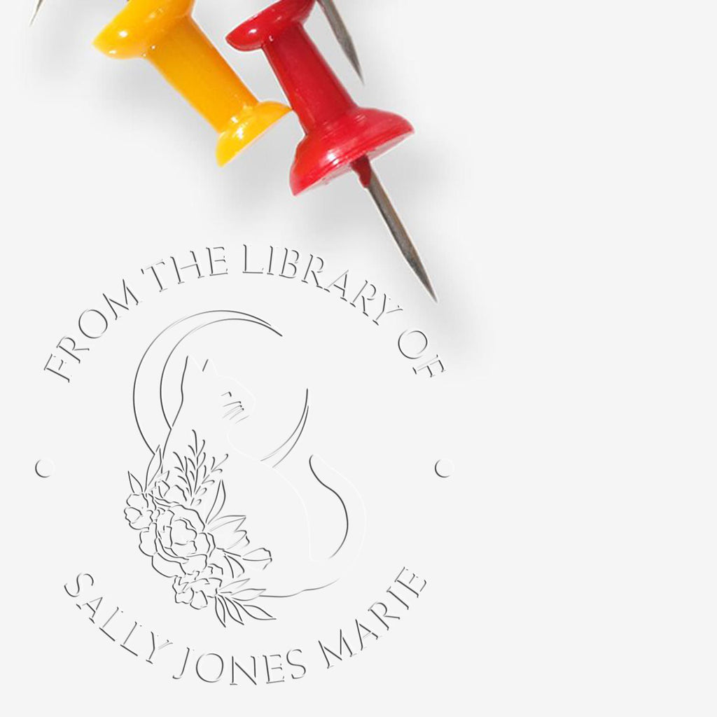 - CUSTOM TEXT OPTIONS: Personalize your embosser with "From The Library Of" or "Ex Libris" along with your name. The elegant round design features decorative dots and your chosen text arranged in perfect arcs around the playful cat motif.