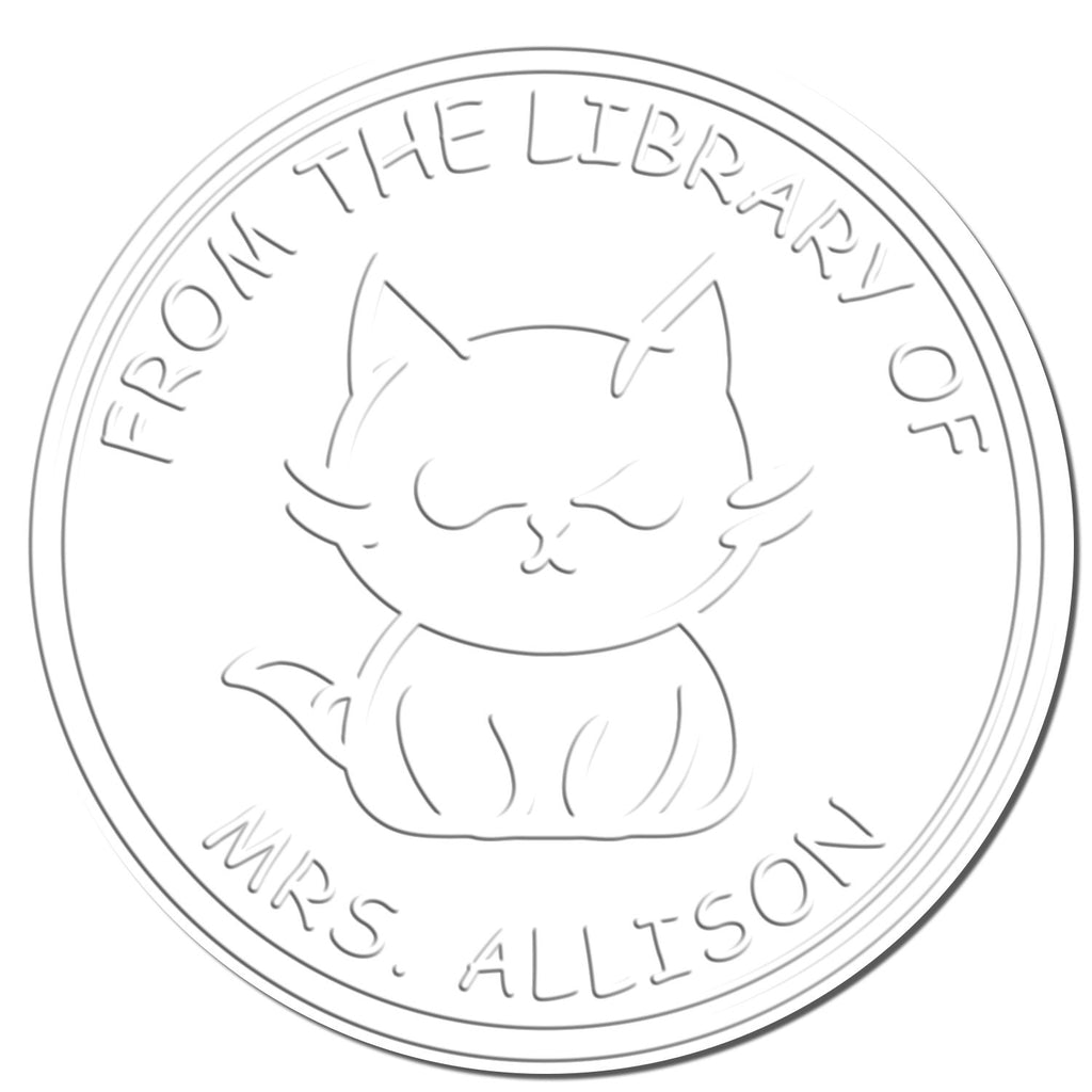 Uniquely Yours: Personalization at Its Finest Imagine walking into your library and being greeted by the sight of your name or a special design embossed on the cover of your favorite books. Our Moody Kitten Embosser features a charming center image of a moody kitten, surrounded by a double concentric solid circular border. The top arc proudly displays "From The Library of," while the bottom arc invites readers to "Read it, Love it, Return it." This unique personalization transforms your collection into a curated gallery of your literary journey, where each title tells a story not only of its content but also of its owner.