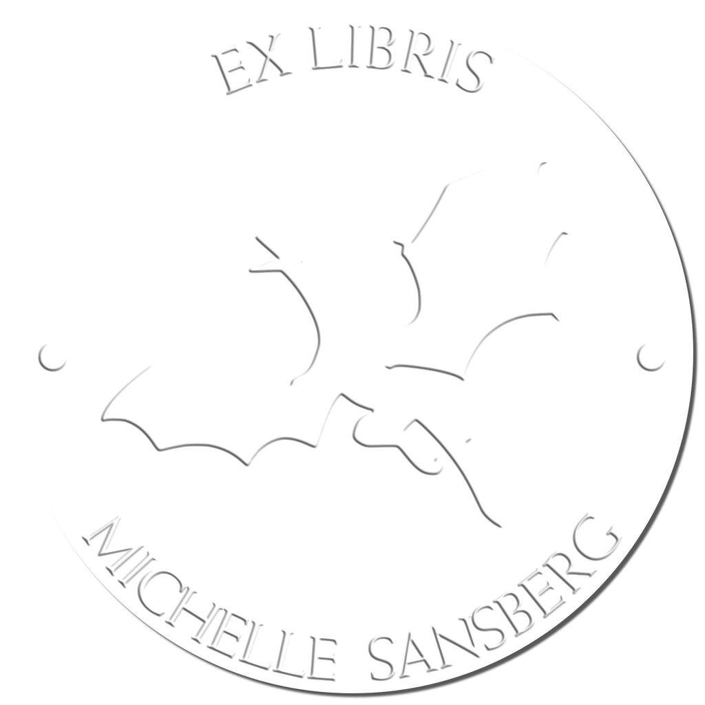 Specifications - Size: 1-5/8" in diameter - Design: Features a center image of a Pulsar Plume Dragon with phrases such as "This Book Belongs To", "From The Library of", and "Ex Libris" at the top arc, followed by your name or another saying at the bottom arc, separated by two dots in the center.