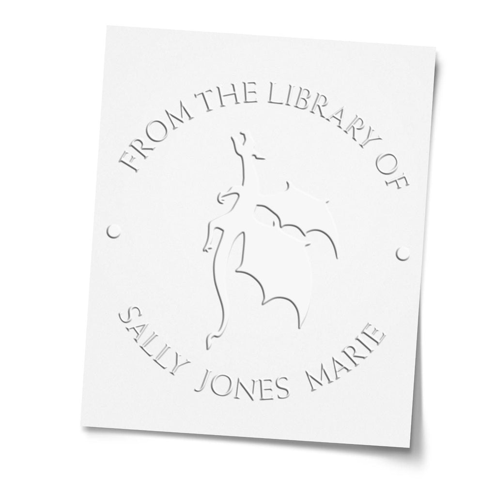 A book embosser is a beautiful way to personalize and protect your cherished books. With an impression size of 1-5/8" in diameter, our design features a stunning Quantum Quiver Dragon at the center, surrounded by phrases such as "This Book Belongs To," "From The Library of," and "Ex Libris"—all customizable with your name or another saying at the bottom arc. The top arc text and bottom arc text are elegantly separated by two dots in the center, creating a clean and sophisticated look.