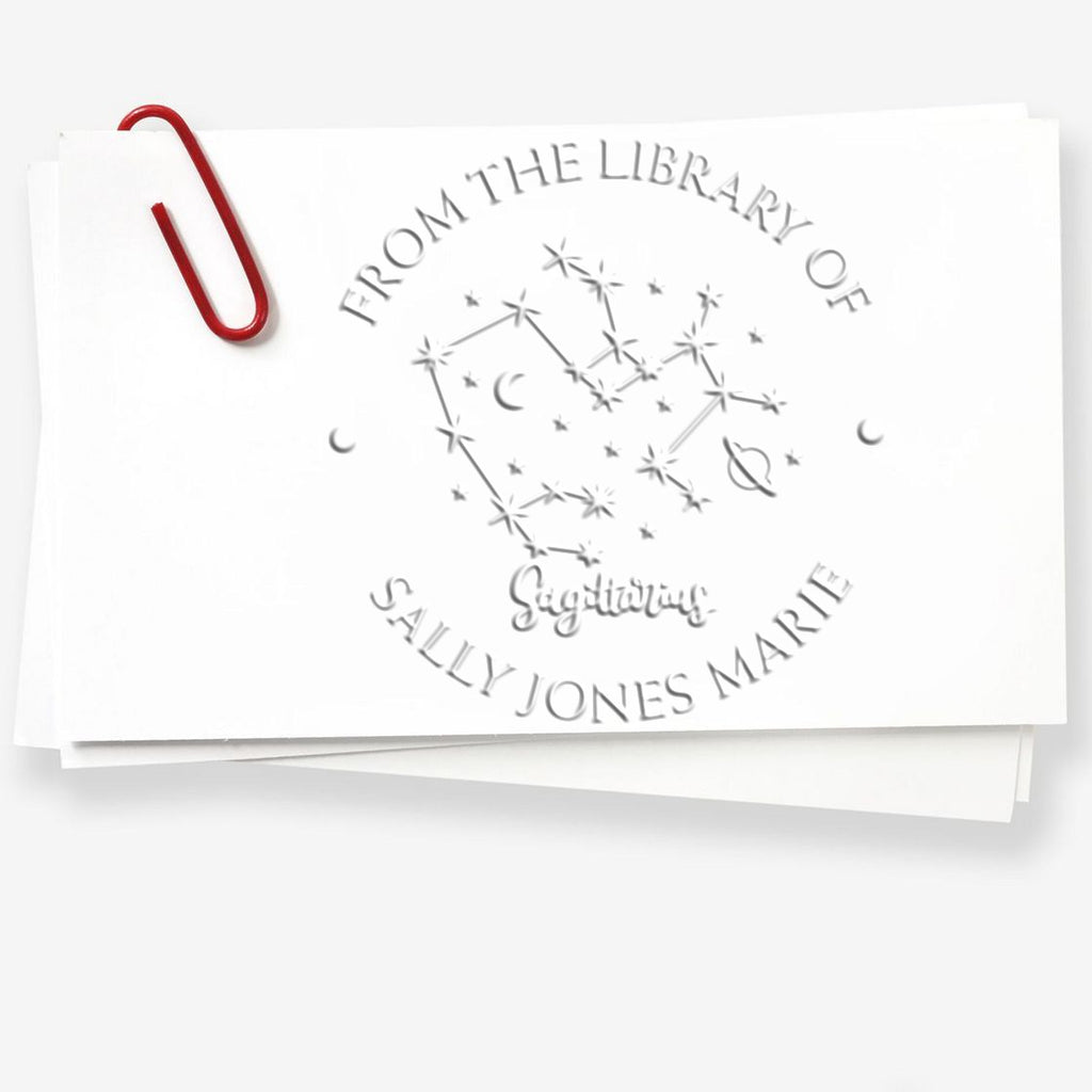Hybrid Sagittarius Constellation with Planet, Moon and Stars Custom Book Ownership Label Embossing Stamp Highlights and Features