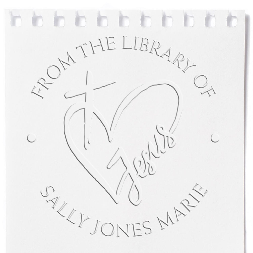 Using a book embosser is a fantastic way to add a personal flair and protect your cherished book collection! With an impression size of 1-5/8" in diameter, our design features a center image of a Solemn Cross with a heart and the name Jesus. The clean round design includes phrases such as "This Book Belongs To" and "From The Library of" at the top arc, followed by your name or another saying at the bottom arc, separated by two dots in the center.