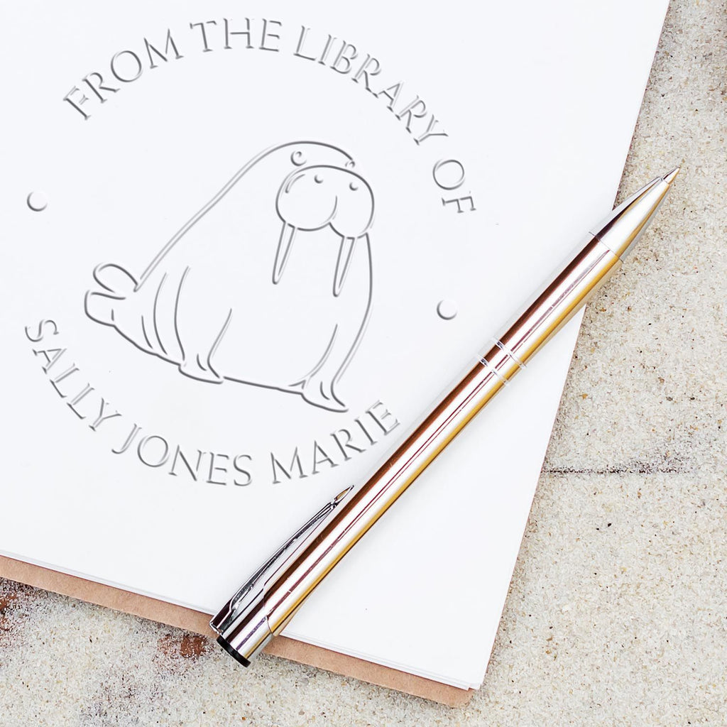Product Specifications - Impression Size: 1-5/8" in diameter - Design Features: A charming center image of a Strong Walrus, with phrases such as "This Book Belongs To," "From The Library of," and "Ex Libris" elegantly displayed. Your name or a special saying can be added at the bottom arc, separated by two dots in the center.
