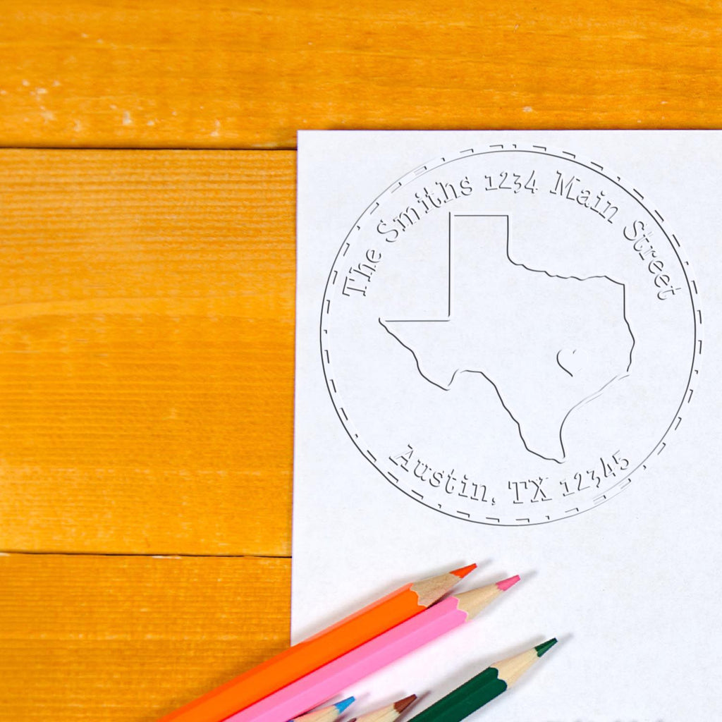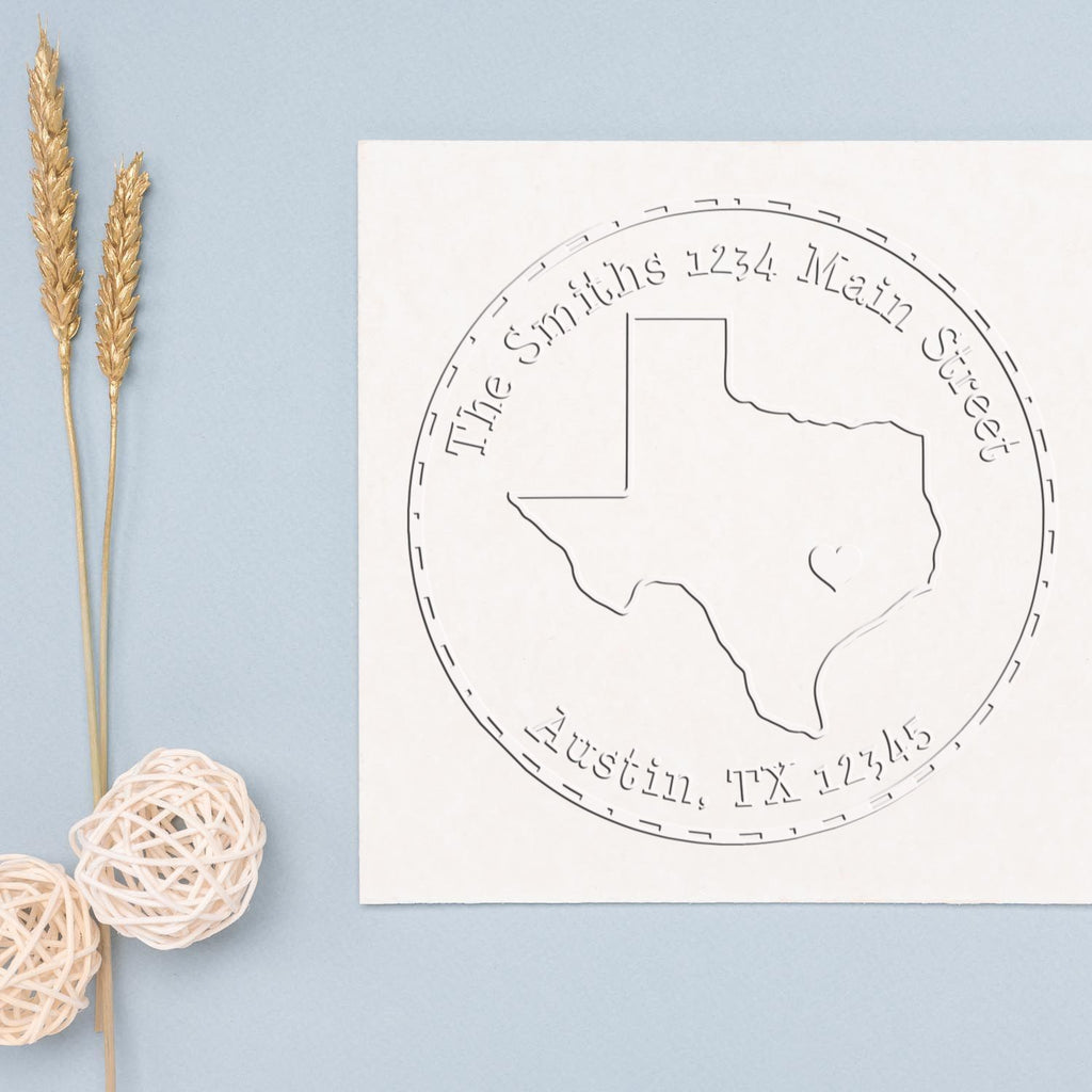 - PROFESSIONAL TEXAS PRIDE: Showcase your Lone Star spirit with our custom address embosser featuring an elegant Texas map design with a heart over Austin. Perfect for making an unforgettable impression on business correspondence.