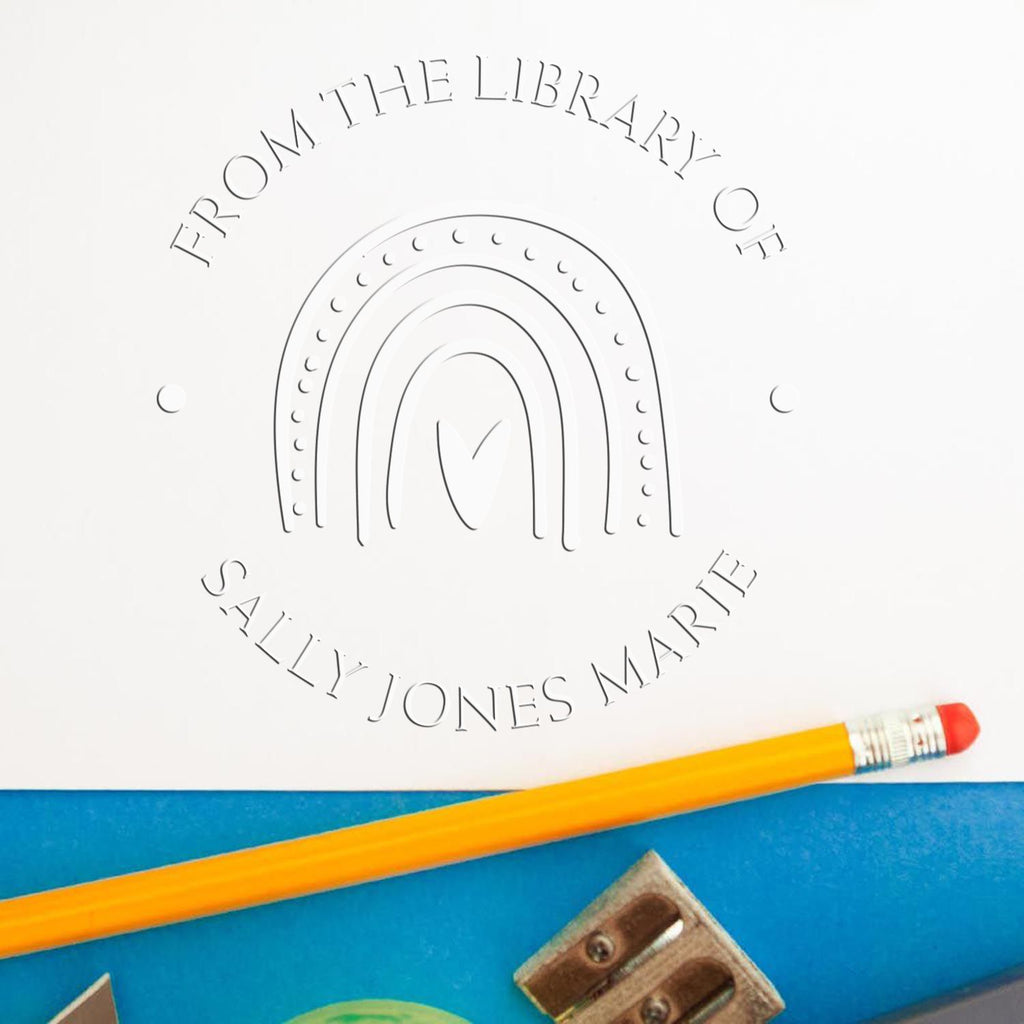 đ Personalize Your Collection Make your library uniquely yours with our customizable embosser! Featuring a delightful center image of a whimsical rainbow, this design allows you to add your name, initials, or a special phrase to showcase your love for reading. The clean round design includes phrases such as "This Book Belongs To," "From The Library of," and "Ex Libris" at the top arc, with your personalized text elegantly displayed at the bottom arc. The impression size is a perfect 1-5/8" in diameter, making it ideal for a variety of book sizes.