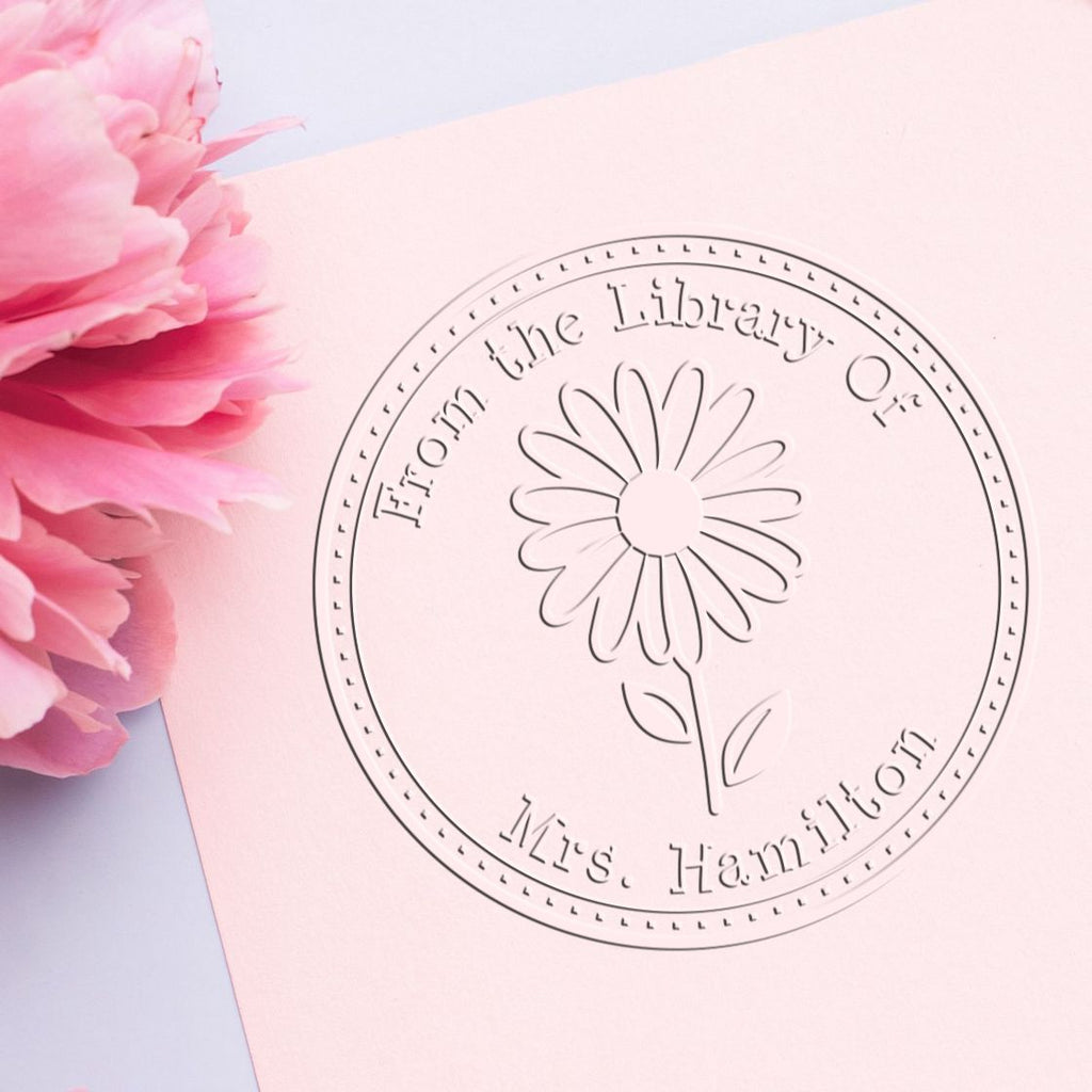 A Design That Speaks Volumes: The Hybrid Winsome Daisy Embosser features a delightful center image of a daisy with a stem and leaves, surrounded by a three-ring border that adds a touch of elegance. The bold circular border, dotted border, and thinner inner line create a sophisticated look. The phrases "This Book Belongs To", "From The Library of", and "Ex Libris" can be elegantly displayed at the top arc, followed by your name or a personal saying at the bottom arc. This unique design not only marks ownership but also enhances the aesthetic of your library, turning it into a stunning showcase of your literary passion.