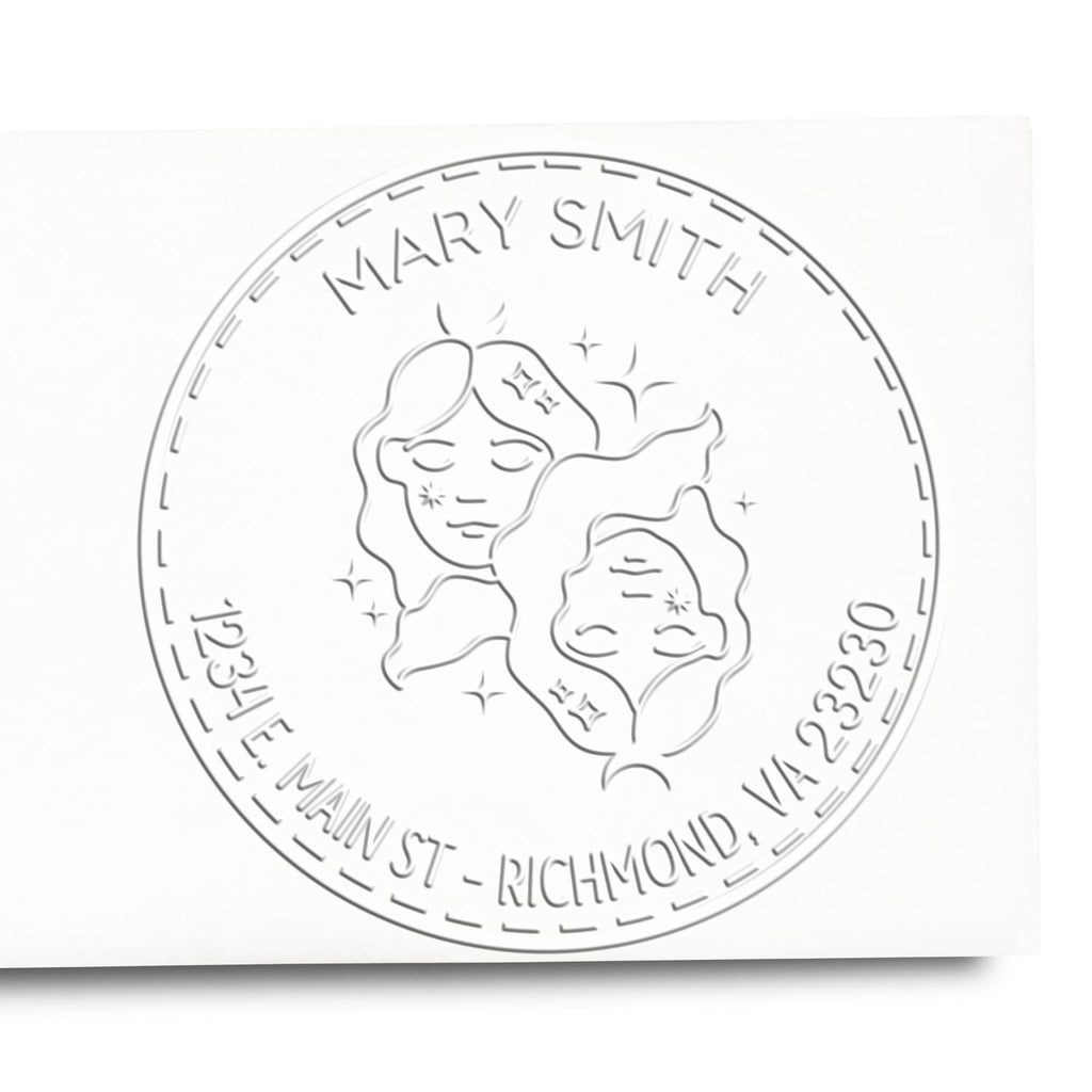 Unique Design Features This zodiac address stamp features twins with half moon and star images over it, the symbol of a Gemini at the center of the image. The design includes a double ring circular border with a solid outer line and a dashed inner line, showcasing your name in the top arc followed by your address or another saying at the bottom arc. The impression size is 1-5/8", making it the perfect size for all your embossing needs.