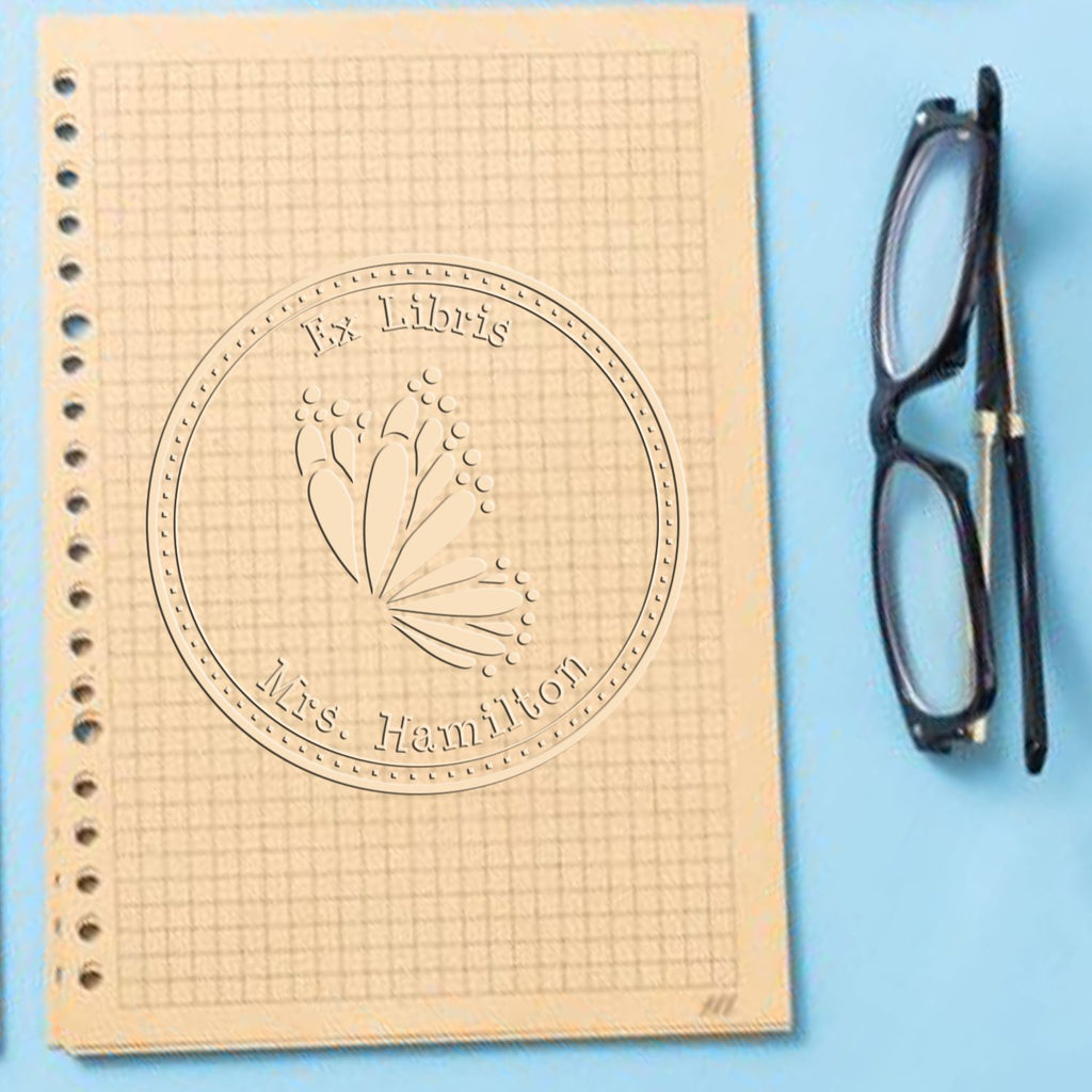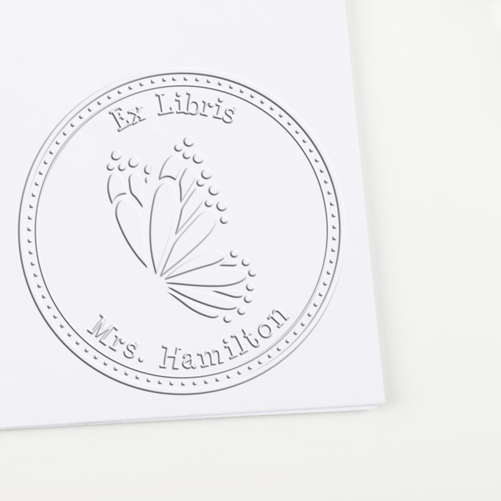 Achieve Perfection with Precision and Comfort Our hybrid seal embosser is engineered to deliver clean, sharp impressions that stand out. With an impressive 1-5/8" diameter, this embosser features a stunning design that includes a center image of a zesty butterfly, surrounded by a sophisticated three-ring border. The phrases "This Book Belongs To," "From The Library of," and "Ex Libris" elegantly arch above your name or a personal saying at the bottom, creating a beautiful and professional finish.