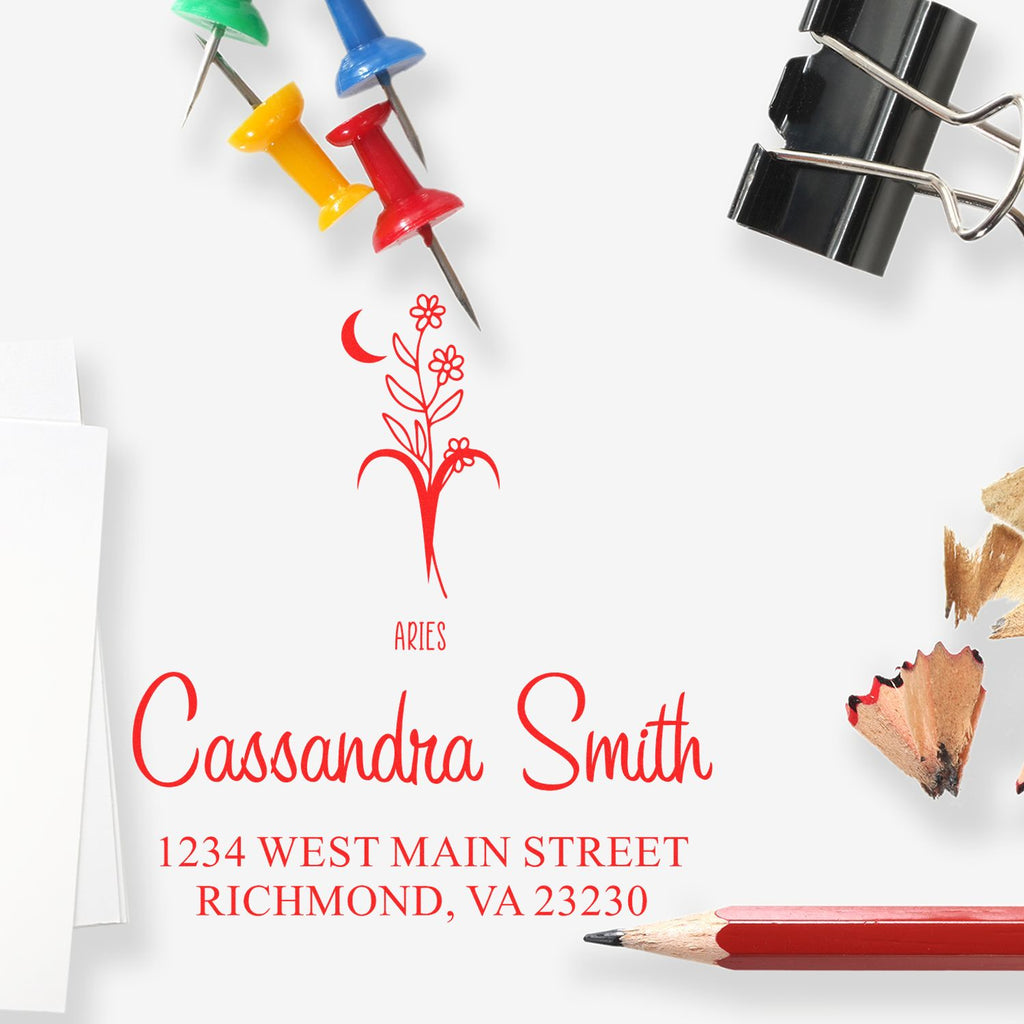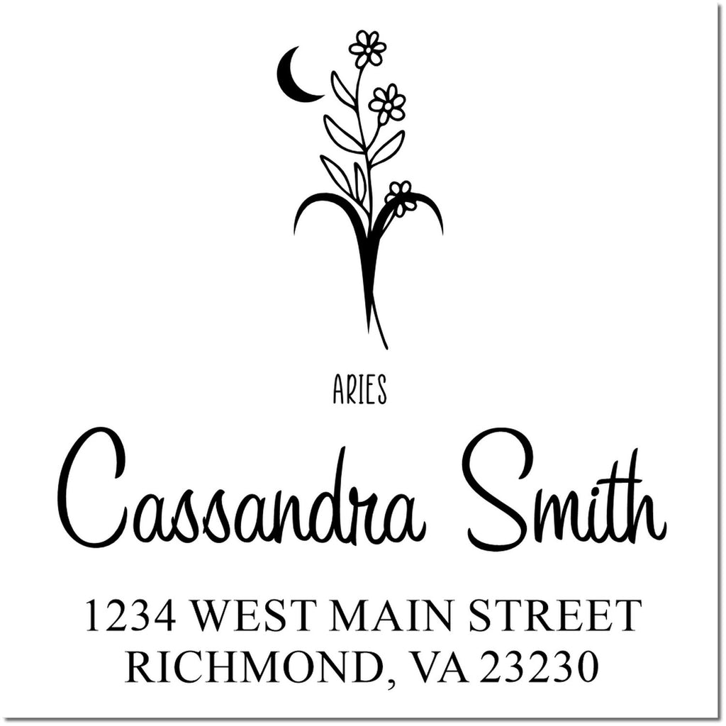 - PERSONALIZED ELEGANCE: Transform your mail with this exquisite Aries zodiac-themed return address stamp, featuring delicate floral accents and astrological symbolism in a compact 1-5/8" square design.