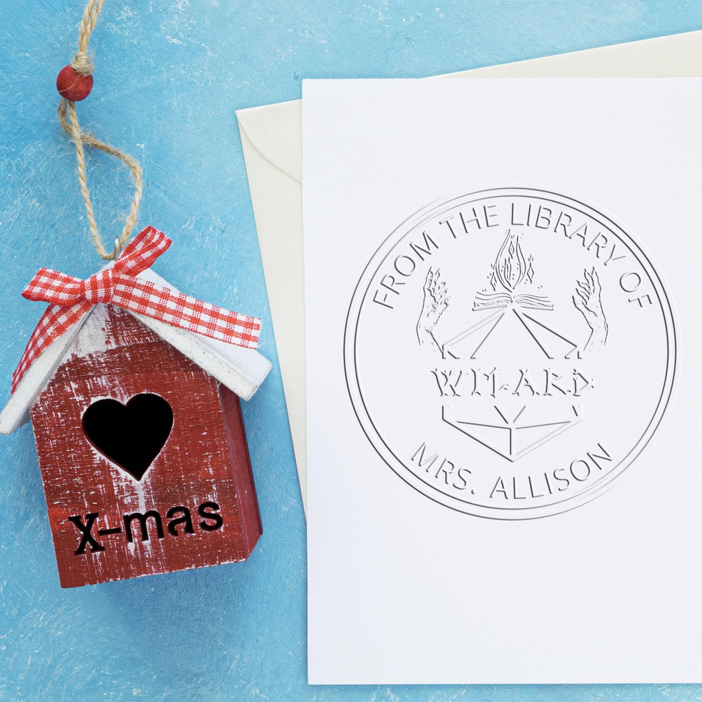 Unleash your inner spellcaster with this extraordinary custom book embosser, featuring a mystical design of an enchanted tome with ascending flames, flanked by spellcasting hands and an arcane pentagon seal. Perfect for personalizing your RPG manuals, campaign guides, and fantasy collections!