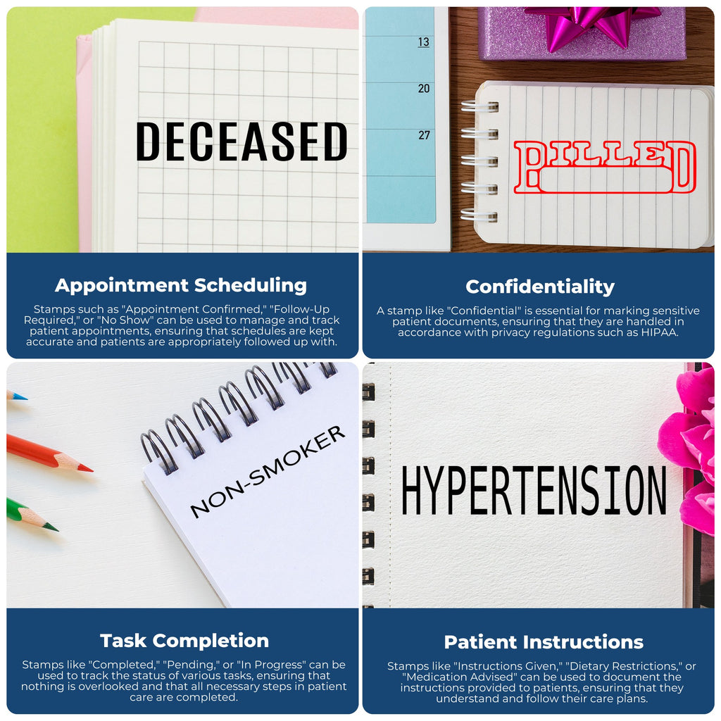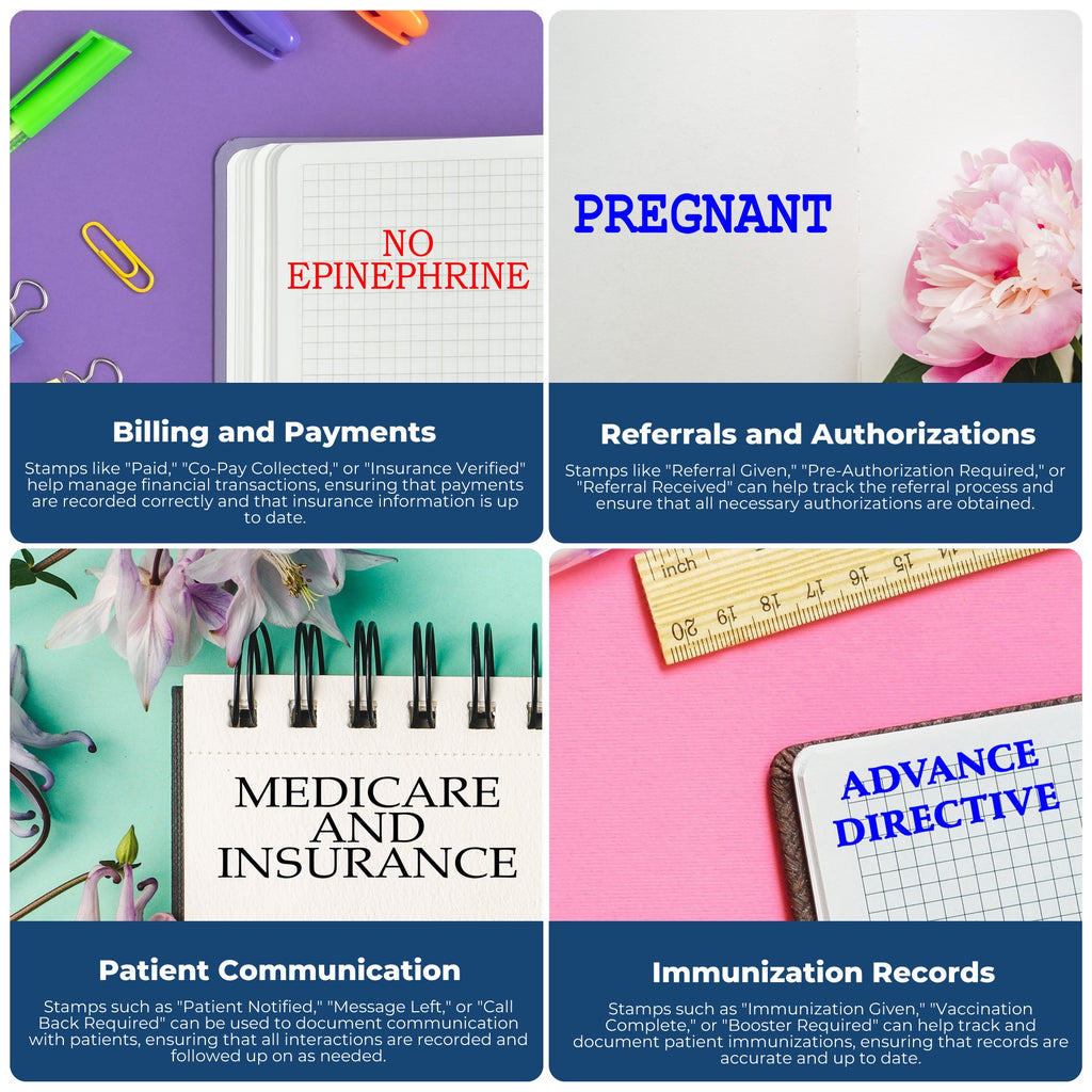 - Organization: The stamp is available in 5 different ink colors, which makes it easy to keep the record-keeping process organized. Each color can be assigned to a specific type of information, such as patient allergies or medical history.