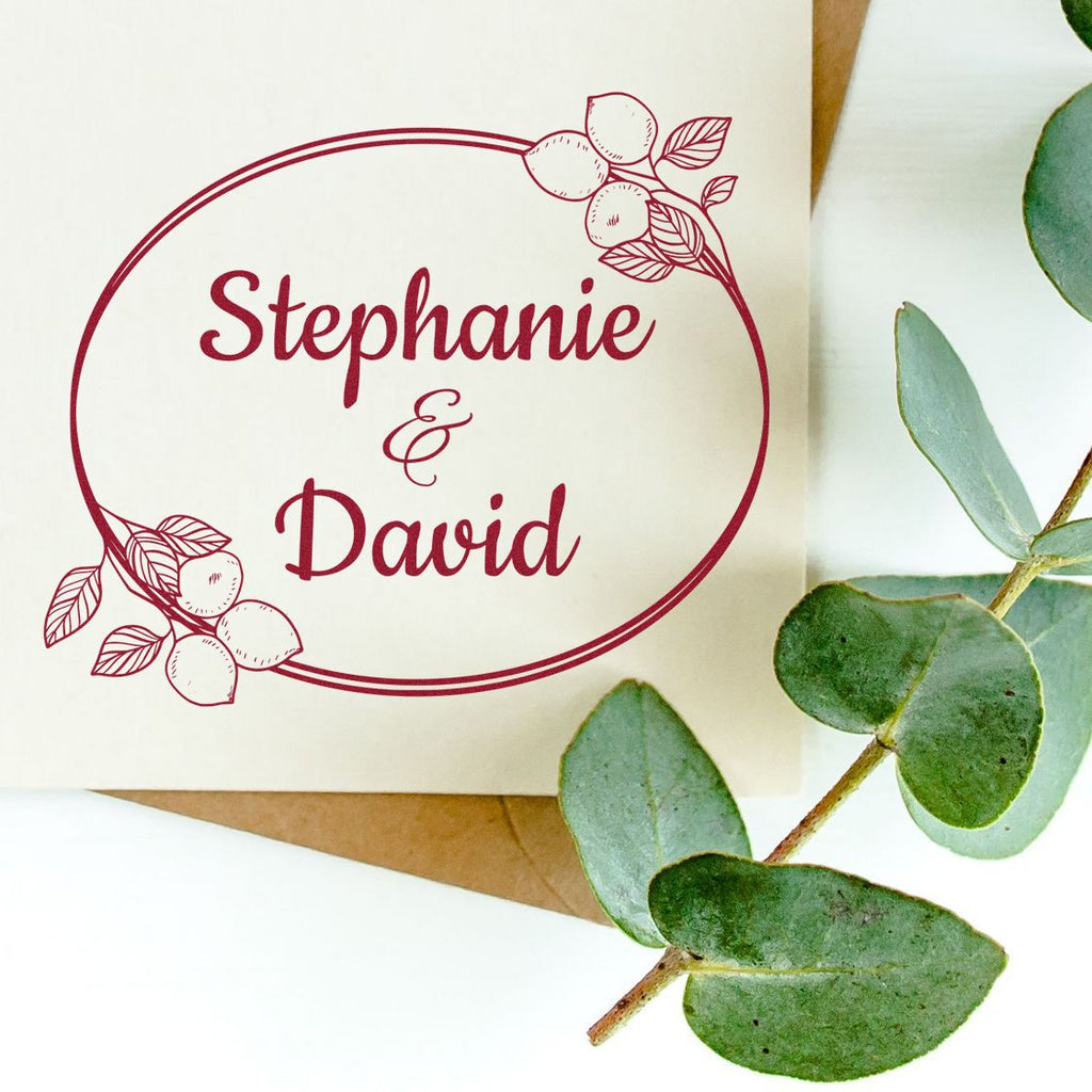 Crafted with precision, this 1-5/8" square stamp features a sophisticated oval border adorned with delicate lemon and leaf motifs, framing your names in graceful cursive lettering. The unique botanical design adds a fresh, romantic touch that sets your correspondence apart.