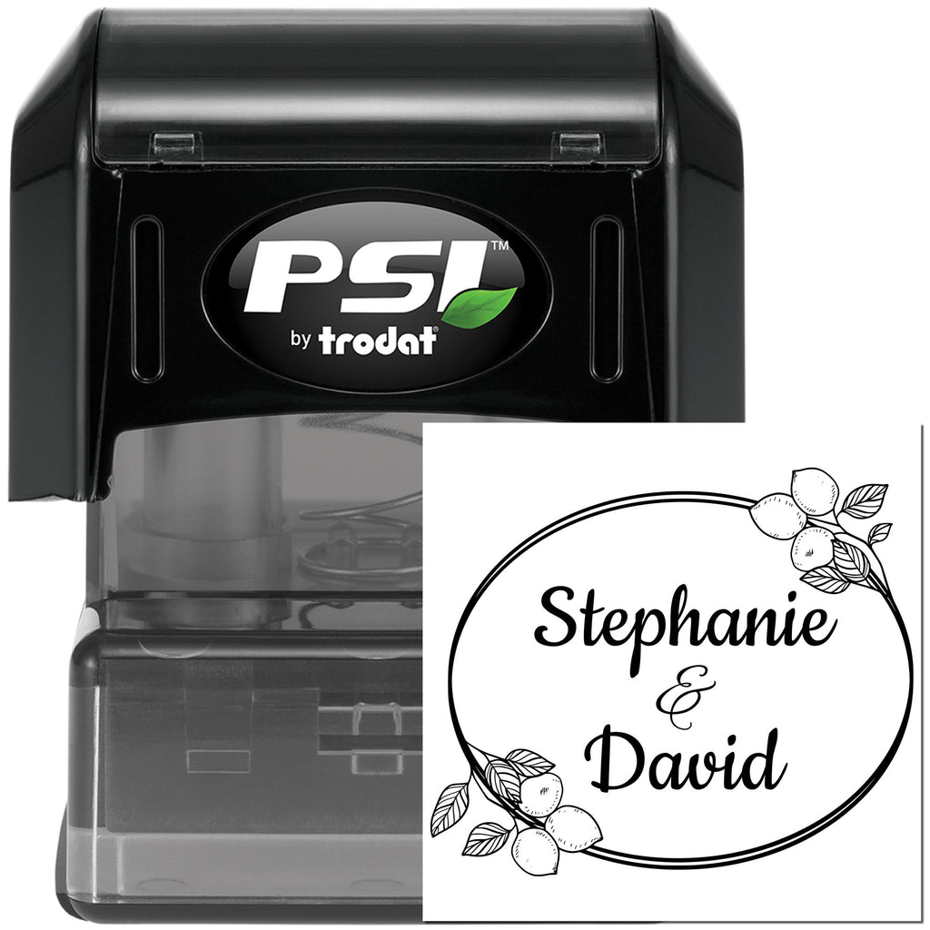 Featuring a sophisticated design with delicate lemon and leaf motifs framing your custom initials, this stamp creates an unforgettable mark on all your materials. The oval-shaped border adds a touch of classic refinement, while the premium oil-based ink ensures smudge-free, fade-resistant results every time.