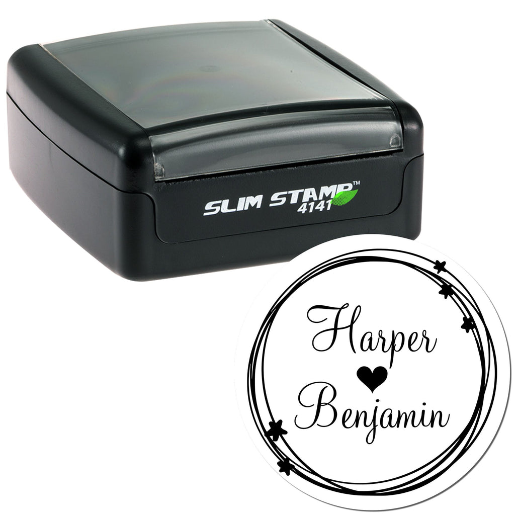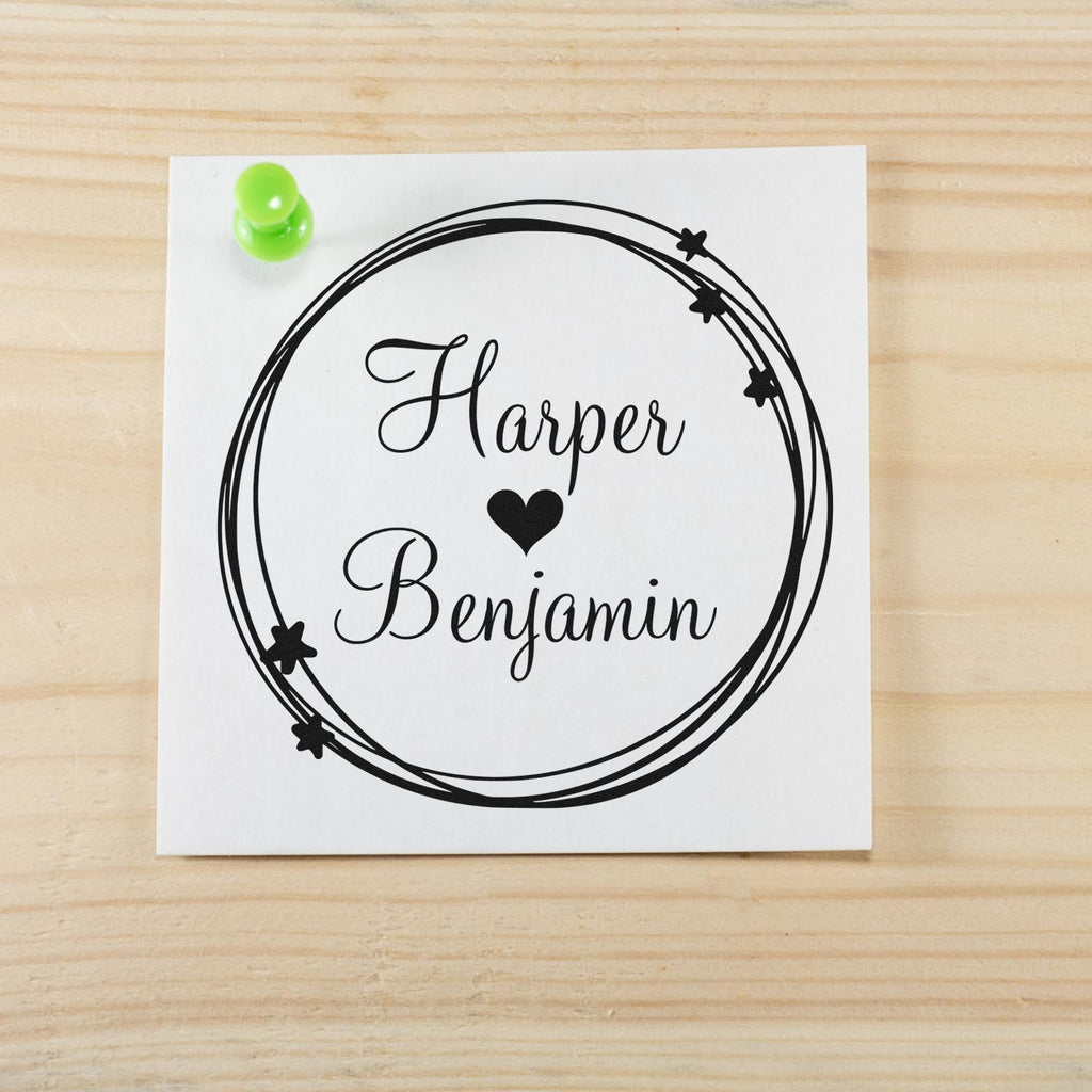 Our stamp features a whimsical, hand-drawn design that captures the essence of love and creativity. The outer circle, adorned with playful star accents, frames the names "Harper" and "Benjamin" in a graceful cursive script, with a heart symbol nestled between them. This charming design not only highlights the romantic connection between you and your partner but also adds a unique flair to your wedding correspondence.