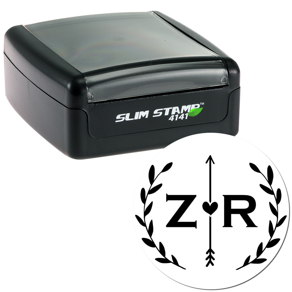 Elevate your event stationery with the Love Darts Custom Couples' Name Stamp, a perfect blend of vintage charm and modern convenience. Designed for couples who cherish personalization, this exquisite stamp features the initials "Z" and "R" in a striking serif font, elegantly divided by a heart-adorned arrow and encased by laurel branches. It's the ideal choice for adding a sophisticated touch to wedding invitations, thank-you notes, and more.