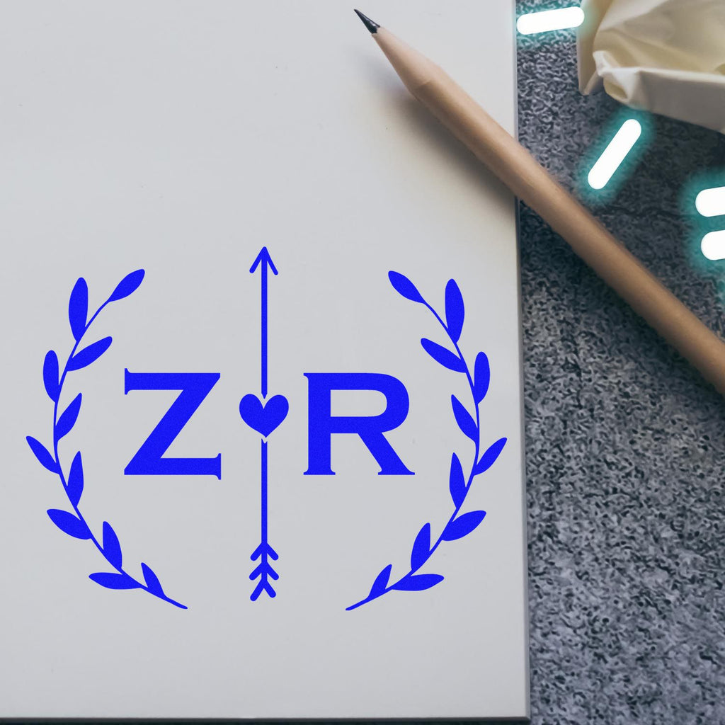 Our custom stamp design is a minimalist masterpiece, featuring bold initials "Z" and "R" in a striking serif font, separated by a vertical arrow adorned with a heart. Encased by two symmetrical laurel branches, this design exudes classic and timeless charm, perfect for adding a personalized flair to wedding invitations, thank you notes, or any correspondence.