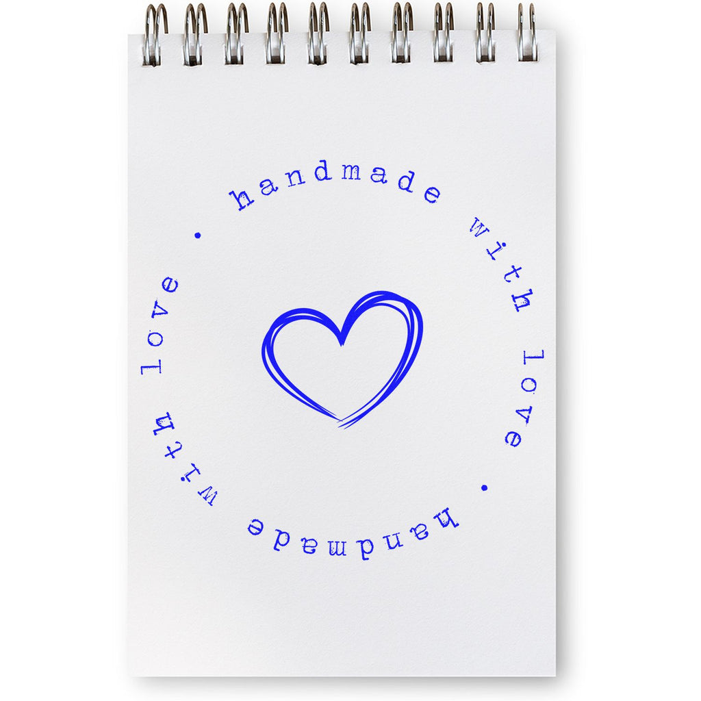 Featuring a minimalist yet rustic style, the stamp showcases a beautifully circular layout. Encircling the design is the endearing message "Handmade with Love," elegantly repeated in a classic typewriter-style font, punctuated by delicate dots for a timeless appeal. At the heart of this design lies a simple, hand-drawn heart, its slightly rough, sketch-like appearance adding a unique, personal touch that perfectly captures the essence of handcrafted artistry.