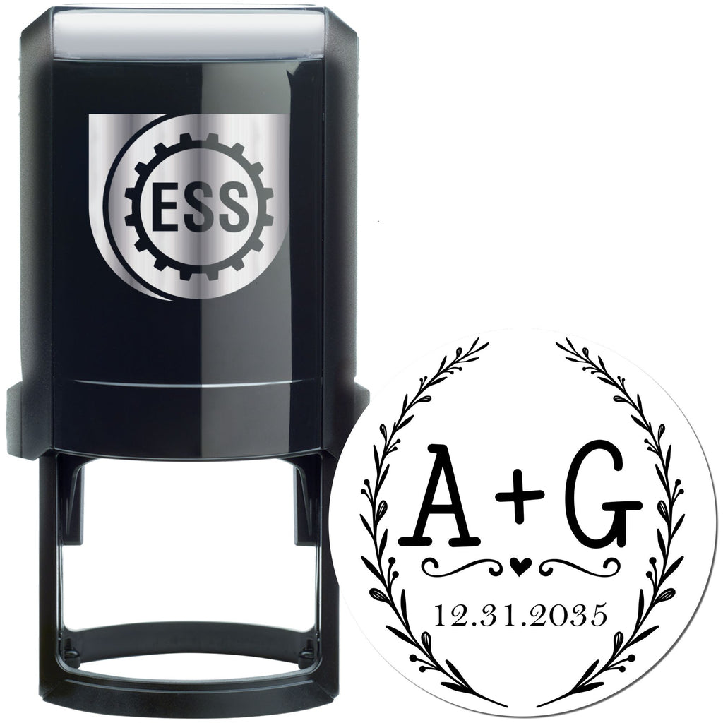 🎨 Color Your World: Choose from a dazzling palette of 11 vibrant ink colors to perfectly match your style or project needs. This 1-5/8" round stamp is designed to impress with its simple yet fancy look. In the center, the letters "A + G" are engraved in a strong, old-fashioned style, accompanied by a tiny heart and the date "12.31.2035". The elegant laurel leaf design around the edge adds a natural touch, making it ideal for any occasion.