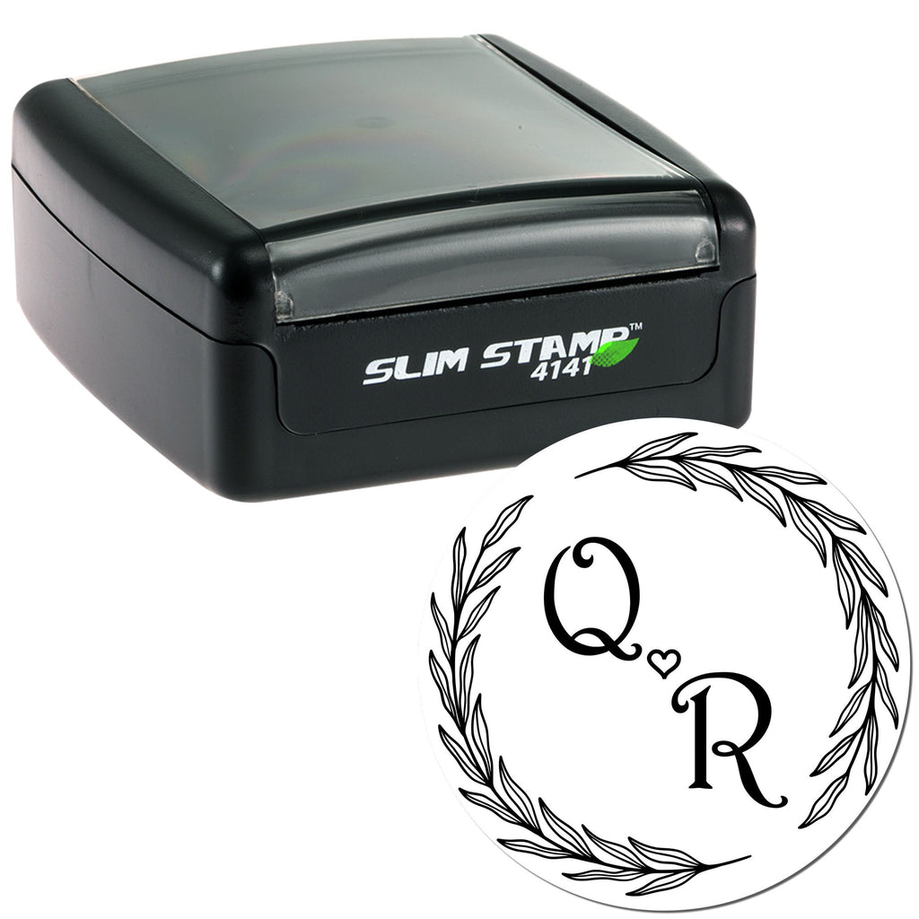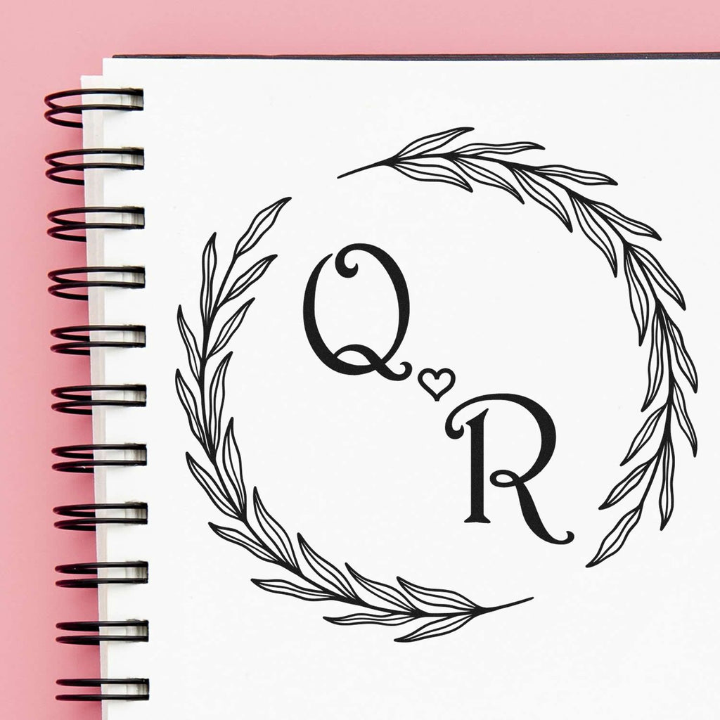 Unleash your stamping superpowers with the Love Laurel Monogram Personalized Couple Stamp! This isn't just any stamp—it's a revolution in stamping elegance and efficiency. Designed for the modern couple, this 1-5/8" round stamp features a stunning wreath of leaves encircling the initials "Q" and "R" in a timeless serif font, with a charming heart nestled between them. Perfect for weddings, anniversaries, or adding a personal touch to your stationery, this stamp is a must-have for engaged couples and newlyweds looking to make their mark.