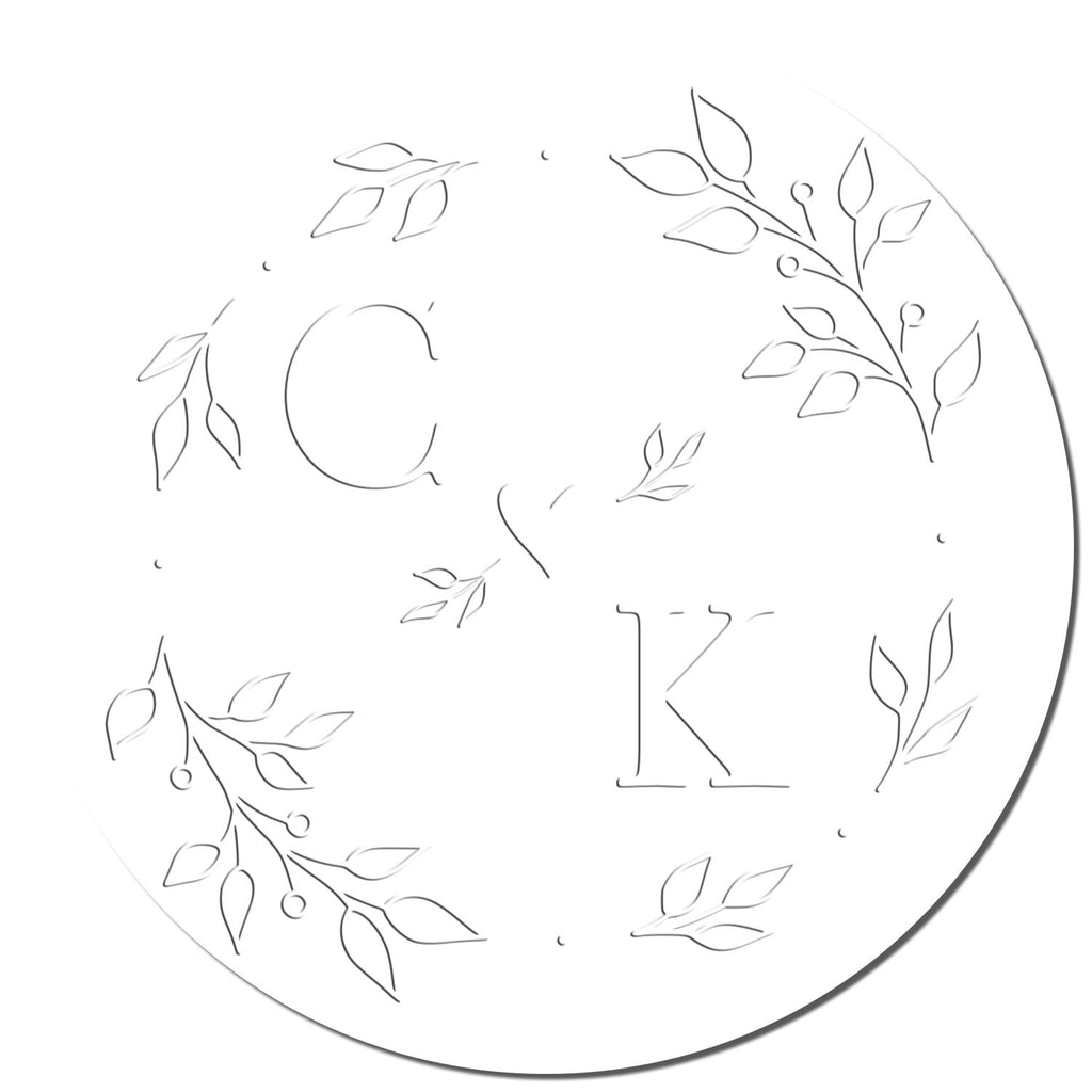 Designed with precision and style, the Love Leaves Embosser features a chic, modern design that combines minimalism with elegance. The initials "C" and "K" are beautifully rendered in a striking serif font, flanking a central heart symbol. Encircling this centerpiece are graceful botanical accents—leaves and tiny berries—arranged in perfect symmetry. The monochrome palette of black on white amplifies its sleek and sophisticated appeal, making it a timeless addition to your creative toolkit.