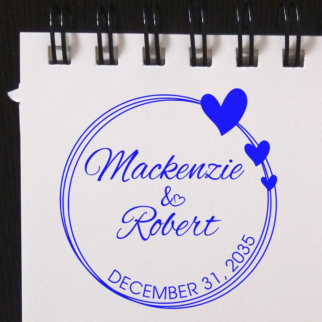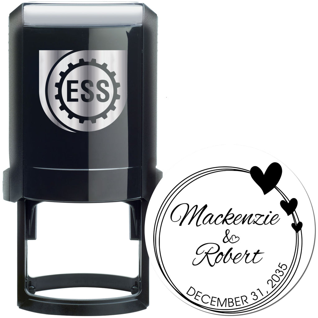 Make Your Love Story Unforgettable with Our Custom Classic Initial Stamper! Perfect for adding that personal touch to your wedding stationery and love letters. This elegant 1-5/8" round stamper features your names in graceful script, adorned with charming hearts and your special date - all beautifully arranged in a timeless circular design.