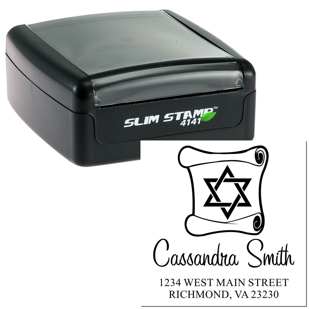 Introducing the Lovely Torah Hebrew Personalized Address Stamper Elevate your correspondence with our exquisite Lovely Torah Hebrew Personalized Address Stamper! This chic square stamp, measuring a compact 1-5/8", is not just a tool; it’s a statement piece that beautifully merges tradition with modern convenience. Featuring a stunning design of a Torah scroll and Star of David, this stamp is perfect for anyone who cherishes their Jewish heritage and wants to add a personal touch to their invitations, holiday cards, and everyday correspondence.