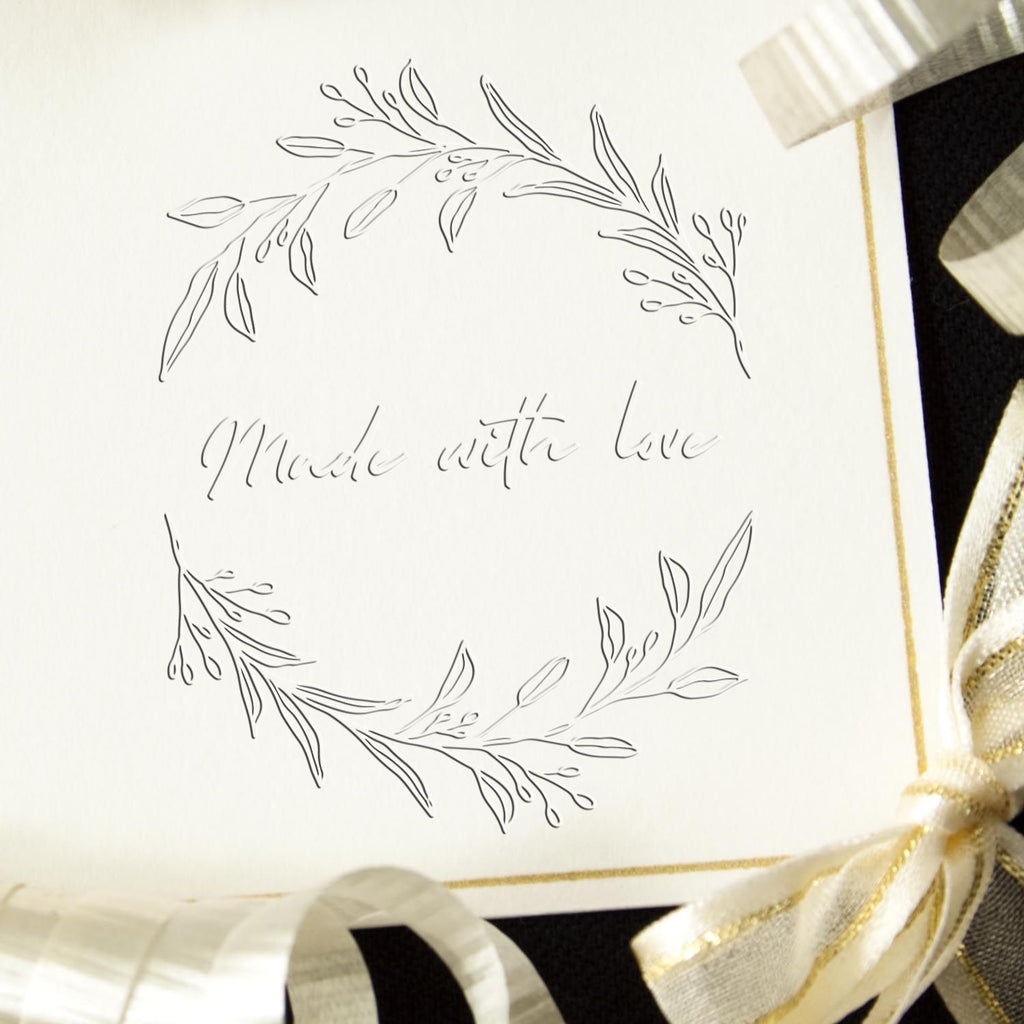 Featuring an exquisite circular design with hand-drawn botanical elements, this handcrafted embosser creates a stunning impression every time. Delicate leafy branches frame the elegantly scripted "made with love" message, adding a touch of organic sophistication to your wedding materials.