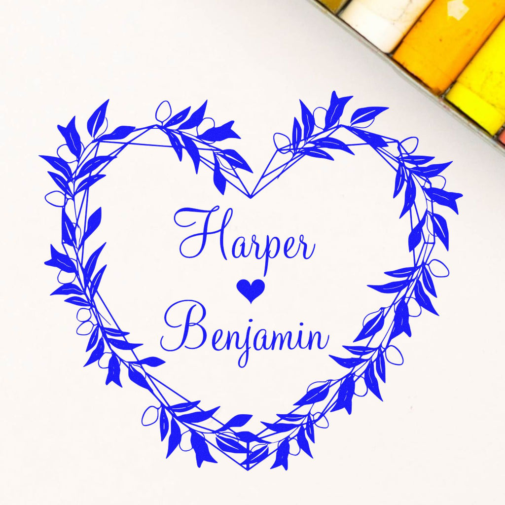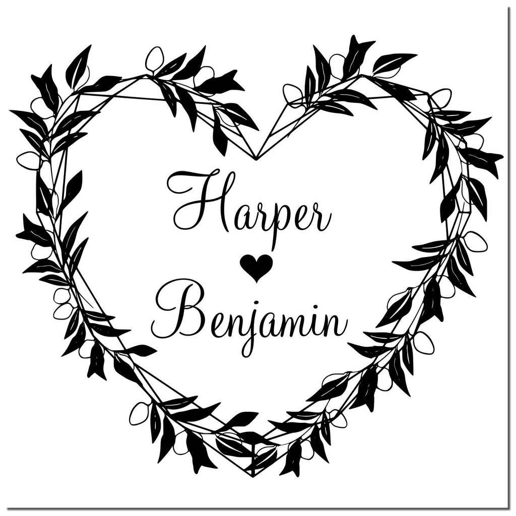 Transform your wedding stationery into works of art with our Love's Leafy Embrace Custom Wedding Stamp - a stunning 1-5/8" square masterpiece that beautifully captures your love story. This pre-inked marvel features an enchanting heart design crafted from delicate vine leaves, with your chosen names elegantly scripted in the center, connected by a charming miniature heart.