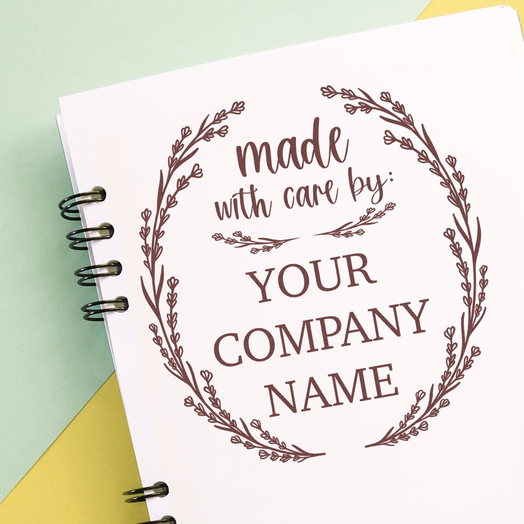 Transform your handcrafted items into professional masterpieces with our exquisite 1-5/8" square maker stamp. Featuring an elegant design with "made with care by:" in graceful script, complemented by your company name in bold lettering, all encircled by a delicate leaf wreath that adds a touch of natural beauty.