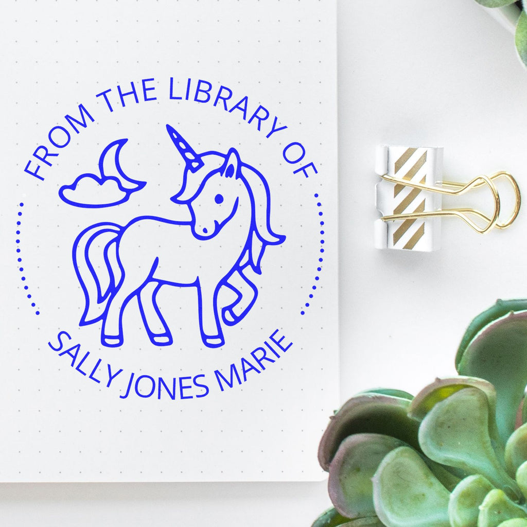 - š¦ ENCHANTING UNICORN DESIGN: Featuring a whimsical unicorn with flowing mane, crescent moon, and cloud details. Custom-made library stamp adds a touch of magic to any book collection.