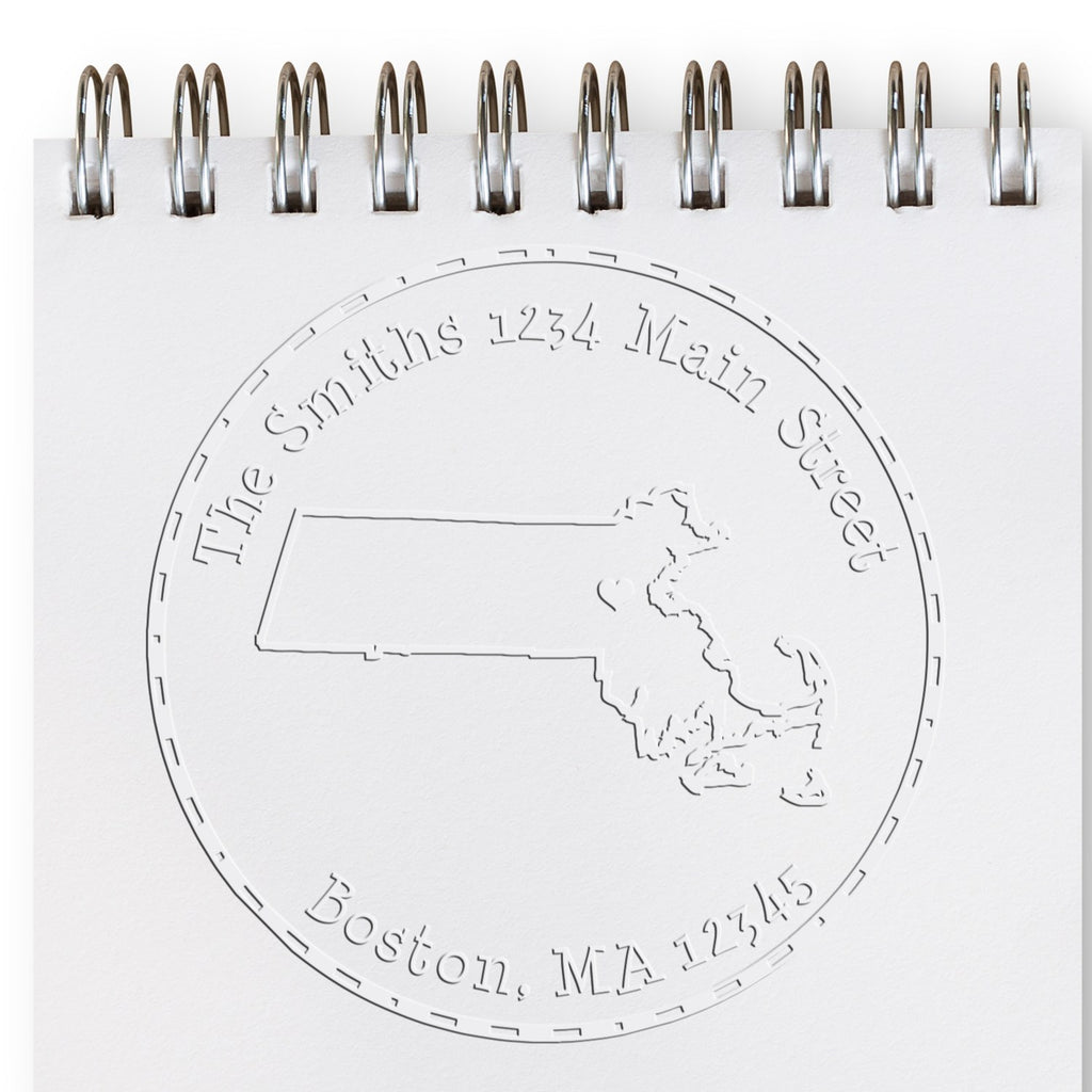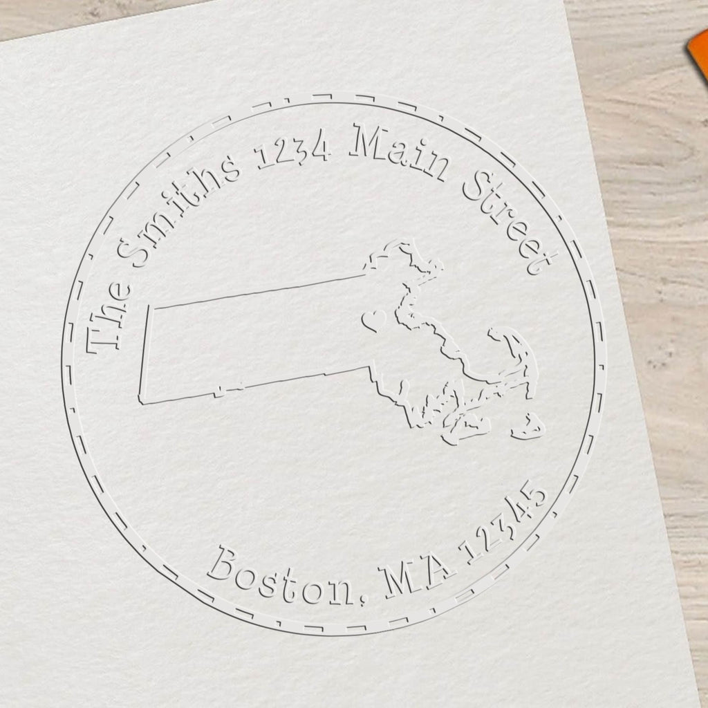 Elevate Your Correspondence with the MA State Love Desk Handcrafted Address Embossing Stamp! Transform your documents into works of art with our exquisite MA State Love Desk Handcrafted Address Embossing Stamp. Designed for those who appreciate the finer details, this 1-5/8" round embosser features a charming outline of Massachusetts, complete with a stylish heart over the capital. The modern text is elegantly surrounded by a decorative border, making it the perfect addition to your personalized stationery collection.