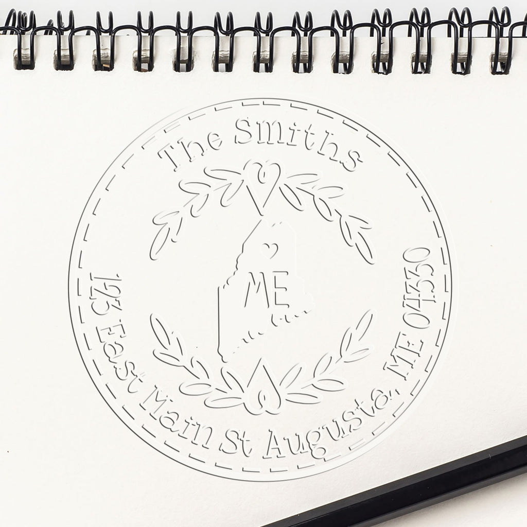 Elevate your correspondence with the Maine Decorative Wreath Customizable Name and Address Embossed Stamp - a perfect blend of elegance and functionality that transforms every envelope into a work of art.