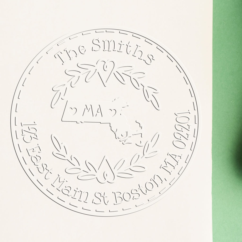Elevate your correspondence with the Massachusetts Decorative Wreath Customizable Name and Address Hybrid Embosser Seal Stamp - a perfect blend of tradition and modern sophistication. This 1-5/8" round embosser transforms ordinary paper into elegant, professionally finished documents with a single press.