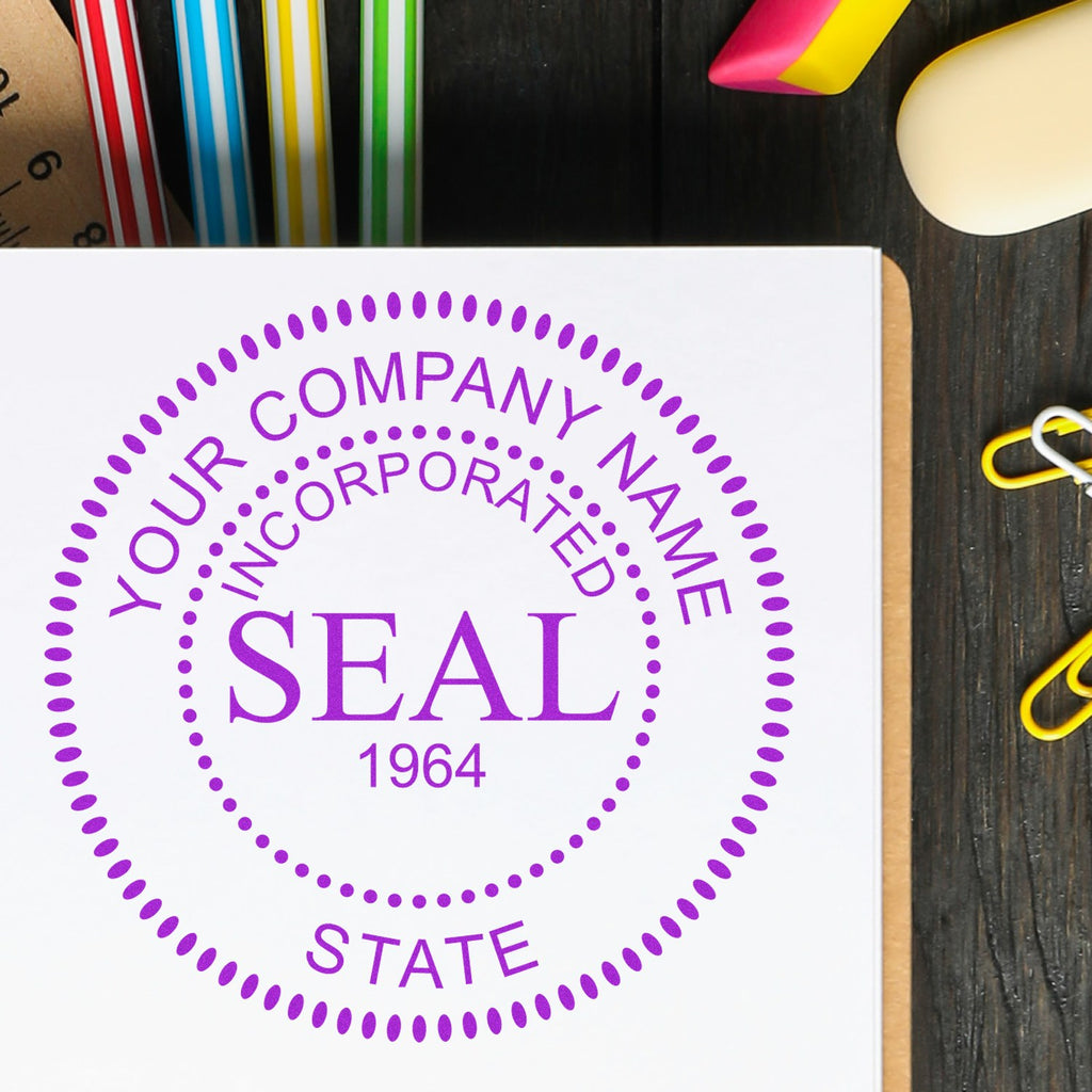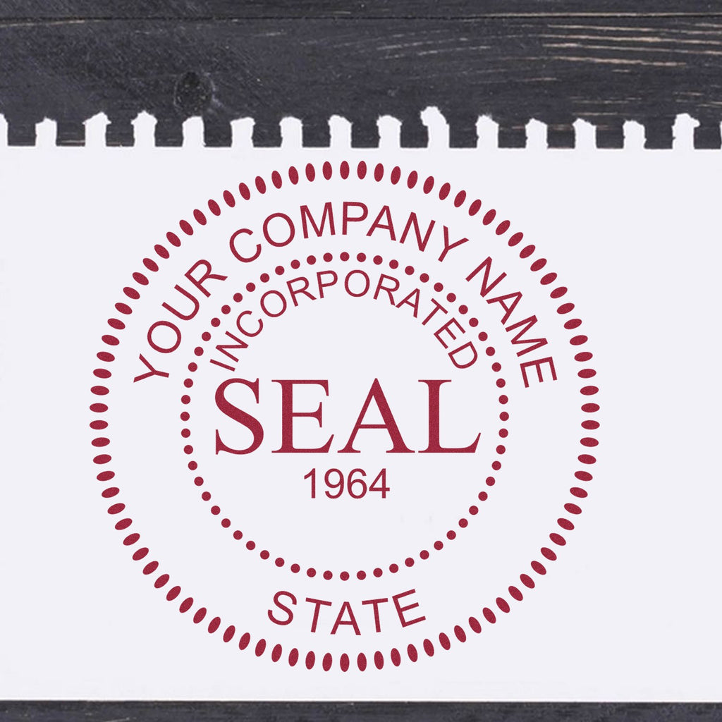 Crafted with cutting-edge technology and exceptional craftsmanship, the MaxLight Pre-Inked Stamp is the top choice for those who require a high-performance stamping solution. Its 1-5/8" circular design features a dotted border, elegantly showcasing your company name at the top, the state at the bottom, and the word "Incorporated" prominently displayed above the word "Seal". The date "1964" is centered just below, adding a touch of tradition to your modern business practices.