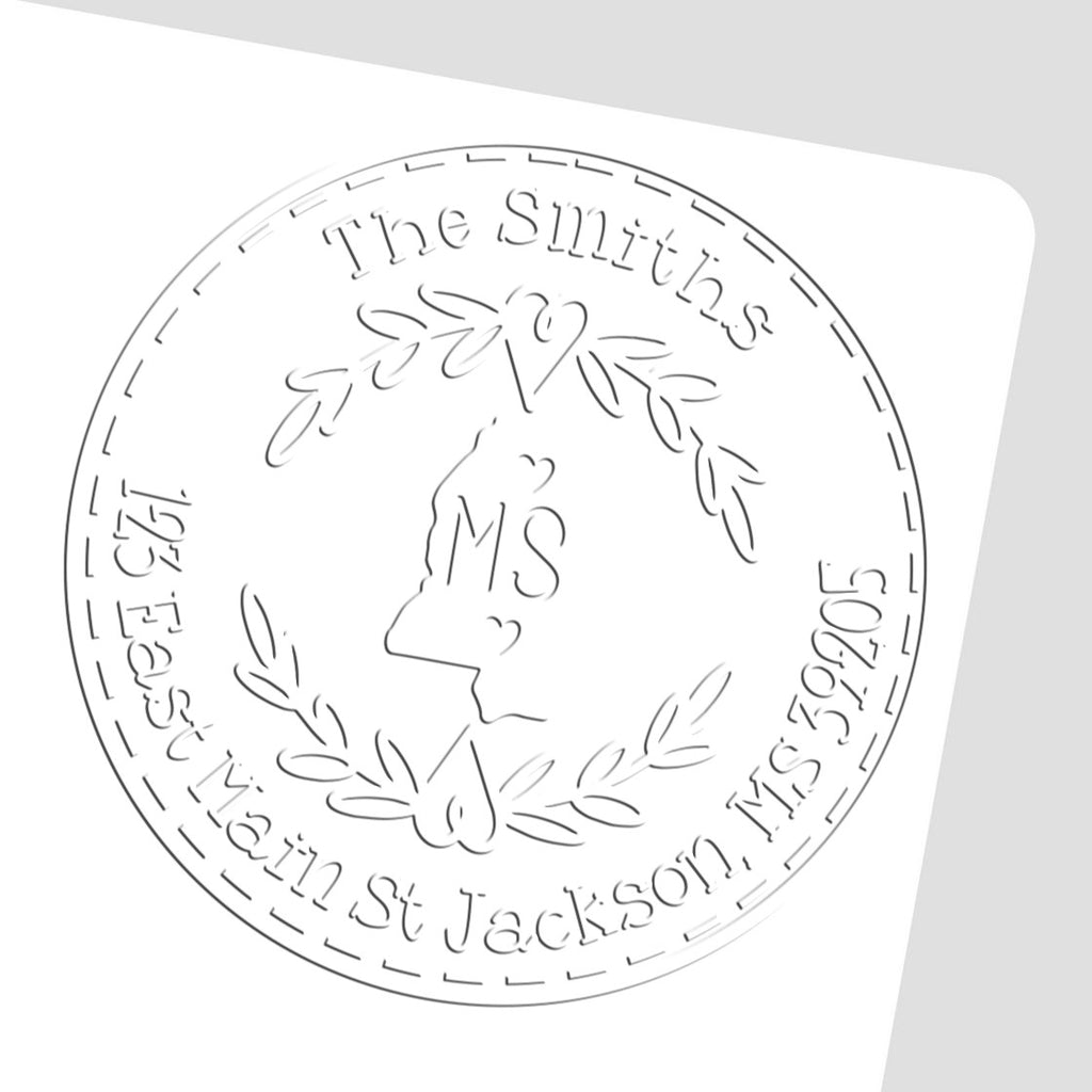 Crafted with precision, our hybrid embosser features a stunning circular wreath design with meticulously detailed leaves encircling your personalized Mississippi address. The classic black and white motif exudes timeless sophistication, while the bold, graceful typography ensures your information stands out with distinction.