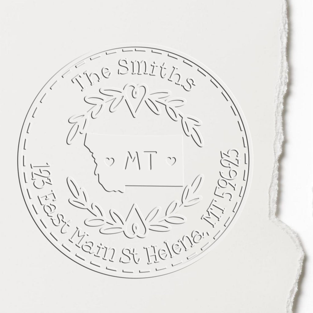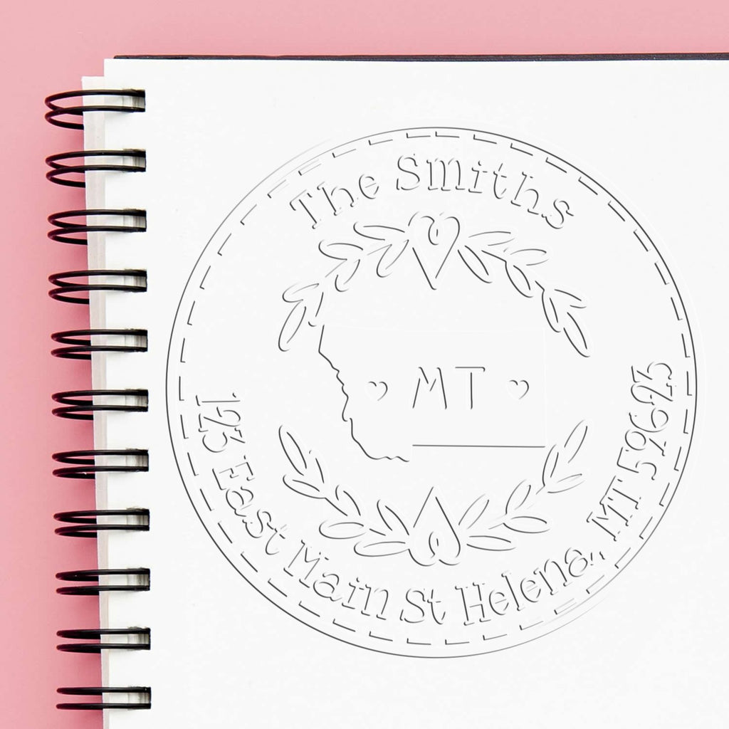 Featuring an exquisite black wreath motif with intricate leaves and branches, this made-to-order embosser creates a sophisticated impression that transforms ordinary mail into memorable correspondence. The bold "Montana" text centerpiece adds a touch of classic authority to every stamp.