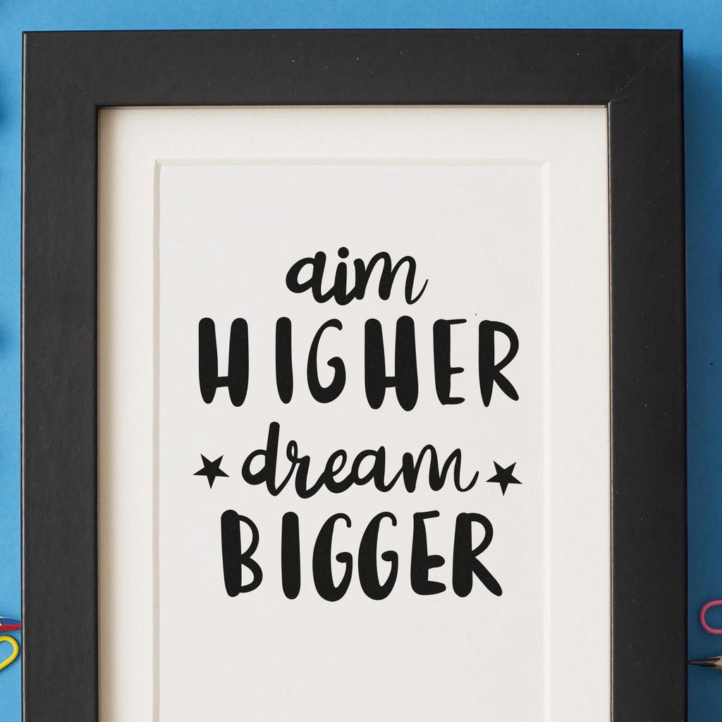 Make a statement with our 1-5/8 Square stamp featuring bold black lettering on a stark white background. The dynamic mix of flowing cursive and thick block fonts, accented by playful star icons, delivers a powerful, eye-catching message: “aim HIGHER dream BIGGER.” Inspire action instantly!