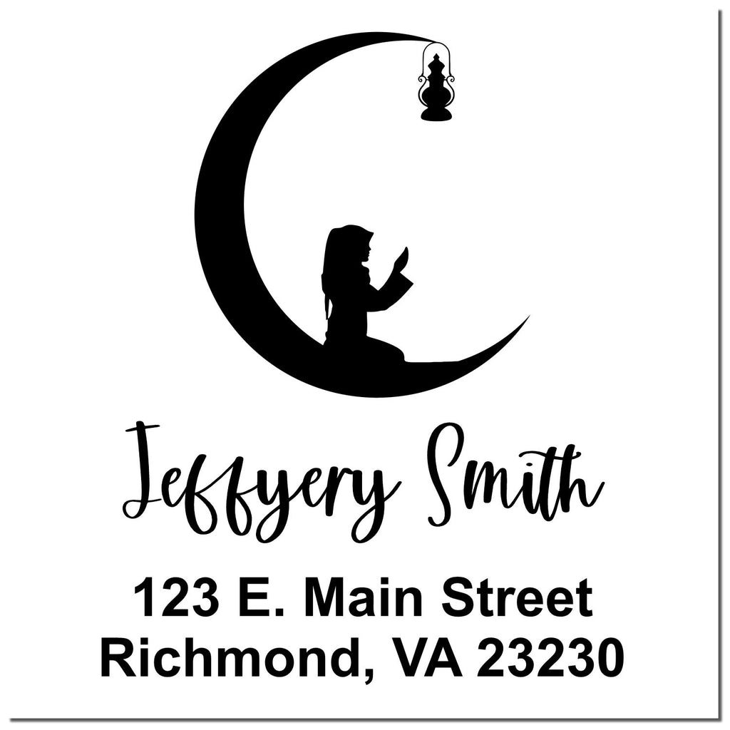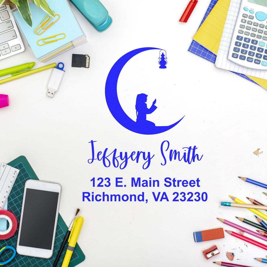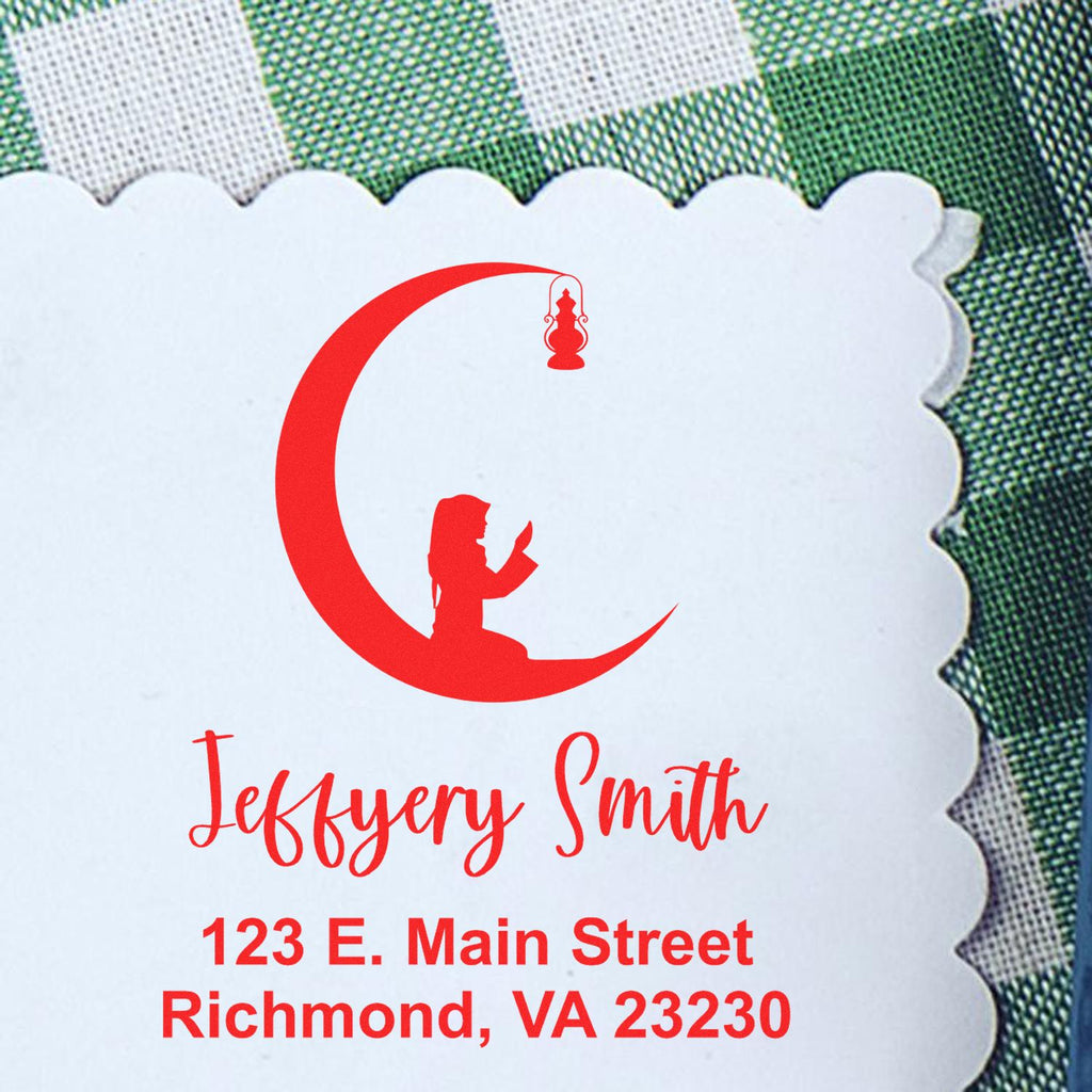 - ELEVATE YOUR MAILING EXPERIENCE with our Muslim Sitting in Prayer Customized Mail Stamper! This unique address stamp features a beautiful design of a girl in prayer within a crescent moon, perfect for adding a personal touch to your correspondence.