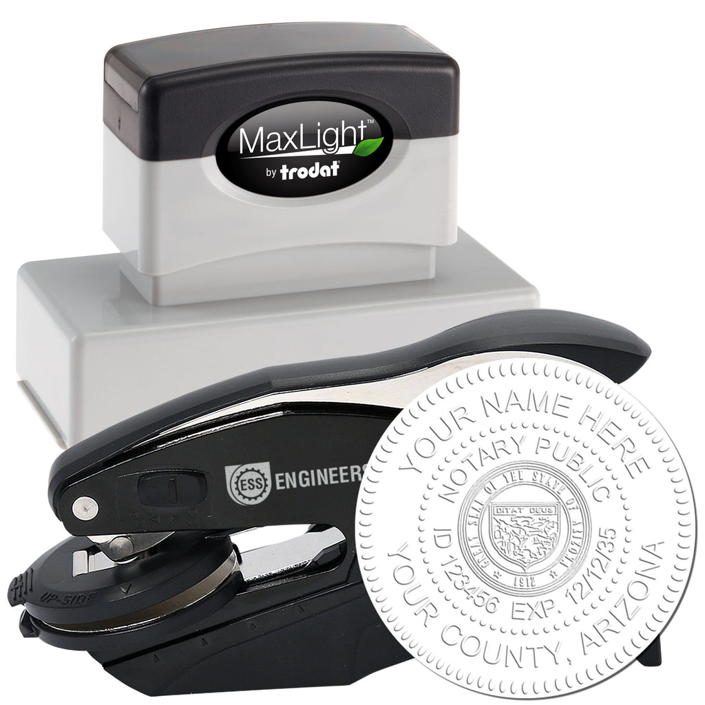 Elevate your Arizona notary services with our premium Notary Seal and Stamp Bundle Kit - the ultimate combination for professional, legally compliant notarizations. This comprehensive kit includes a state-compliant Hybrid Seal Embosser and MaxLight Pre-Inked Rectangular Stamp, designed specifically for Arizona notaries.