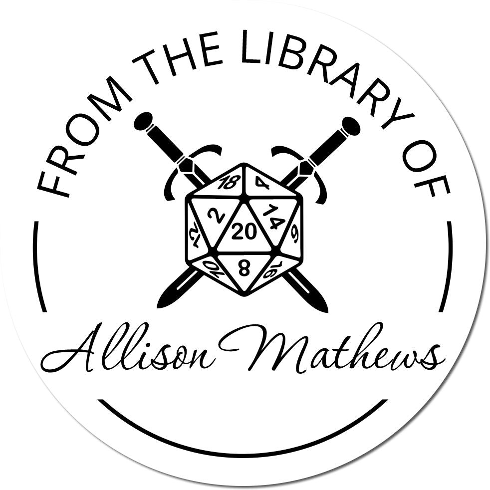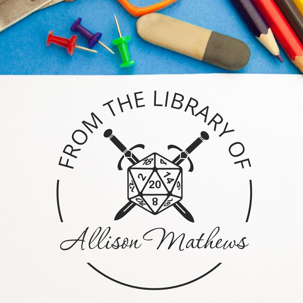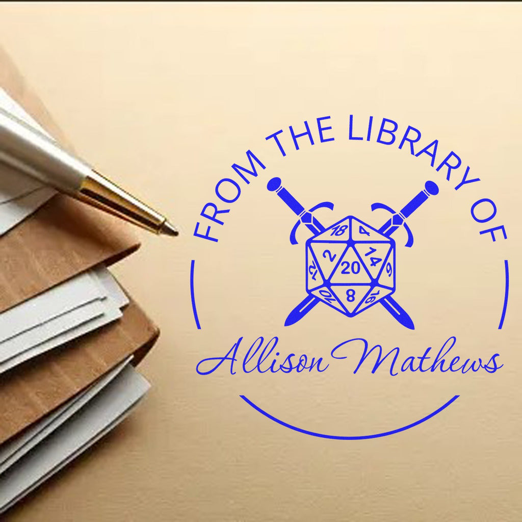 - PERSONALIZE YOUR GAMING COLLECTION with our premium pre-inked book stamp featuring a striking D20 and crossed swords design. Perfect for marking rulebooks, character sheets, and gaming manuals. Measures 1-5/8" for ideal visibility.