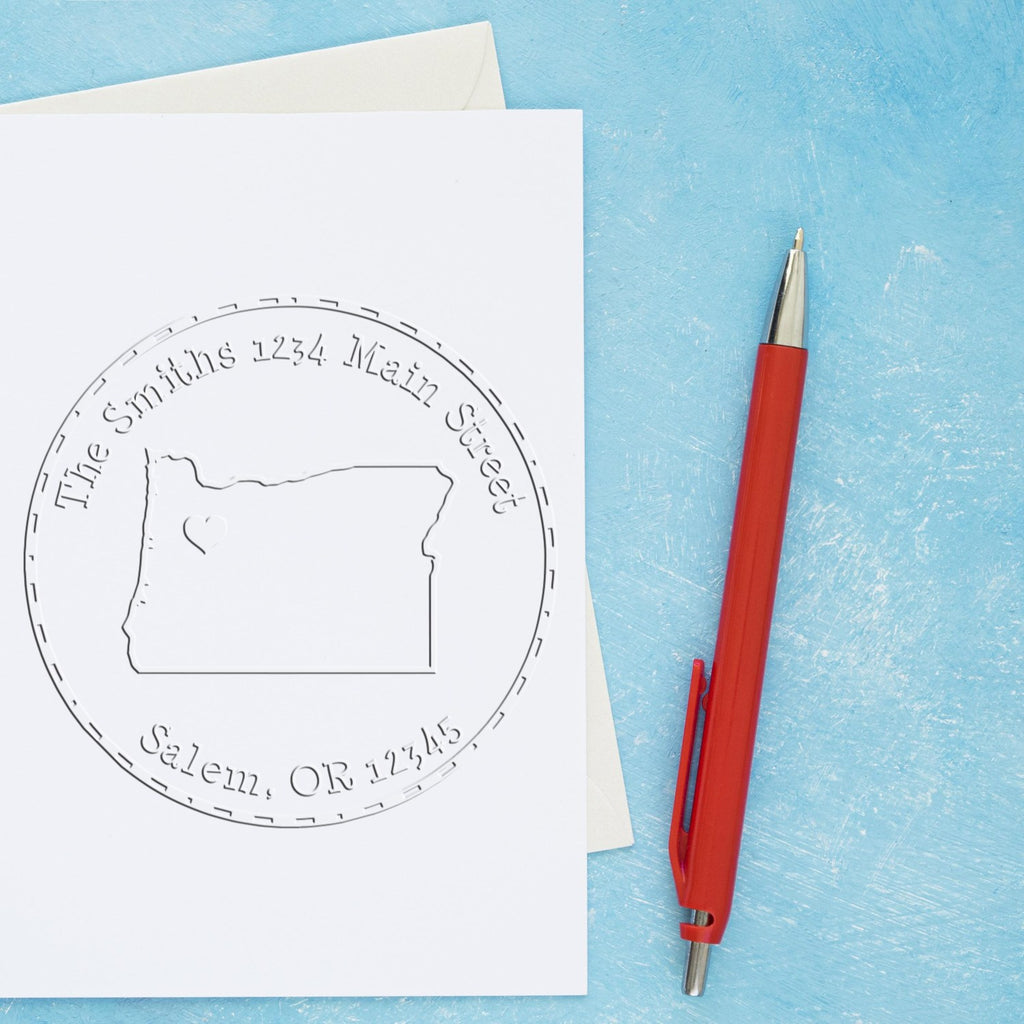 Elevate Your Correspondence with Our Oregon State Love Desk Handcrafted Return Address Embosser! Transform your mail into a work of art with our exquisite 1-5/8" Round Oregon State Love Desk Handcrafted Return Address Embosser. This stylish tool not only adds a unique geometric flair but also elevates your correspondence with a modern touch that truly stands out. Featuring a beautifully crafted outline of the state of Oregon adorned with a charming heart over the capital, this embosser is perfect for anyone who cherishes personalized stationery and values unique, handcrafted items for their correspondence.