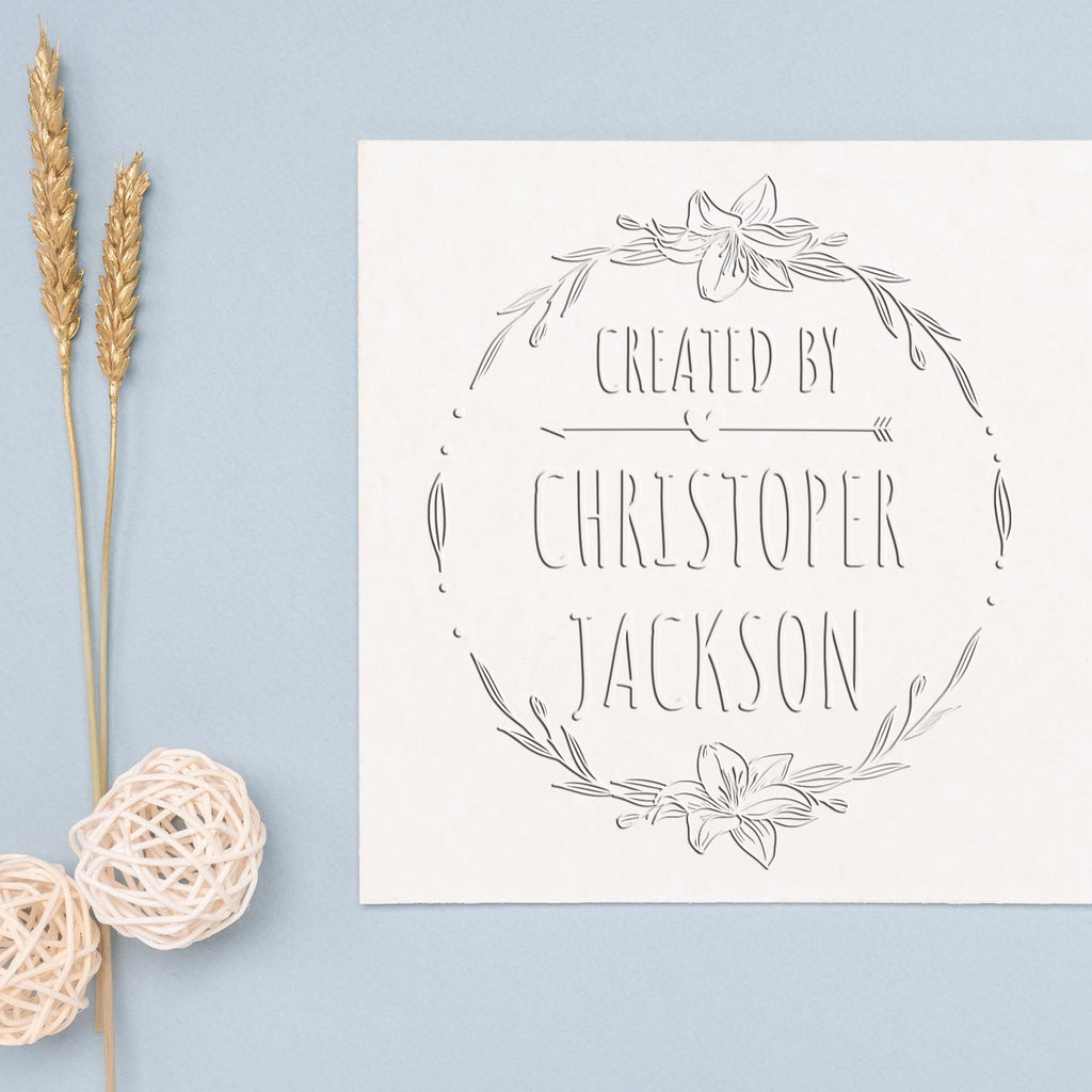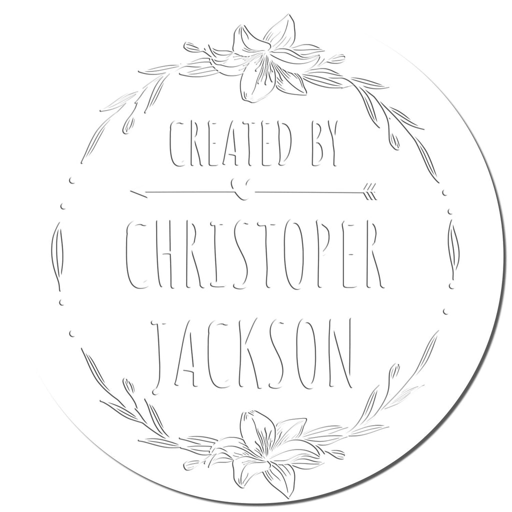Crafted with elegance and precision, the Petal Artisan Desk Embosser features a chic botanical design. Imagine sleek floral sketches adorning the top and bottom, with dainty leaves and branches forming a wreath-like border. The phrase "Created by" sits stylishly above an arrow adorned with a heart, leading to the name "CHRISTOPHER JACKSON" in bold, uppercase letters. This 1-5/8" round seal is not just a tool; it's a statement piece that combines modern sophistication with a hand-drawn, organic flair.