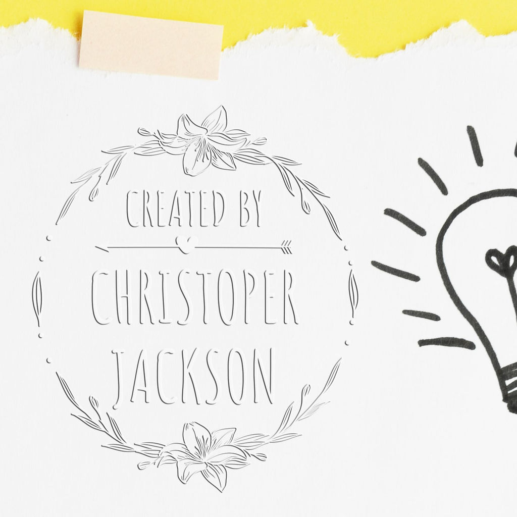 Featuring an elegant botanical design with flowing florals and a sophisticated wreath border, this custom embosser showcases your name with striking clarity. The modern composition includes the phrase "Created by" followed by your name in bold uppercase letters, accented with a charming heart-adorned arrow - perfect for adding your signature touch to wedding stationery, craft projects, or professional documents.