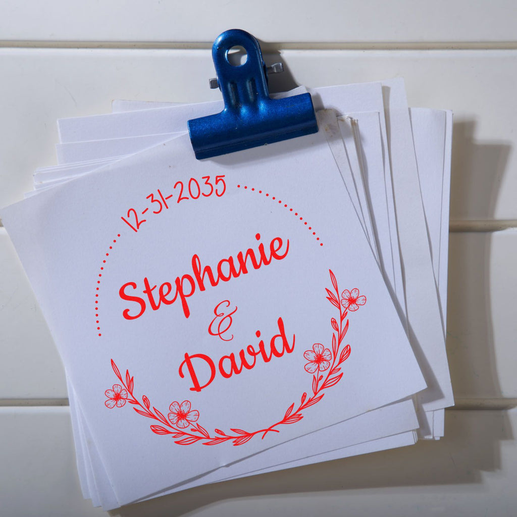 - PERSONALIZED ELEGANCE: Transform your wedding stationery with our 1-5/8" round custom stamp, featuring your names and date surrounded by delicate floral details. Perfect for invitations, thank-you cards, and wedding correspondence.
